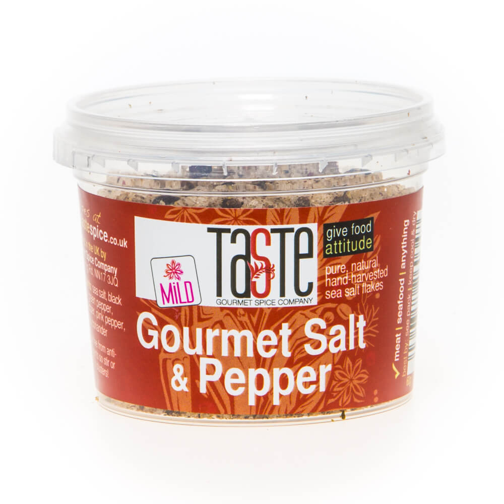 Our Gourmet Salt & Pepper is gorgeous blend of hand-harvested, pure & natural British sea salt with freshly ground black, pink, white & green peppercorns, allspice berries & even a touch of coriander. This really is an incredible finishing salt and adds a lovely warmth, suitable for seasoning meat, especially ribs & chicken wings, fish, veg – in fact, anything!