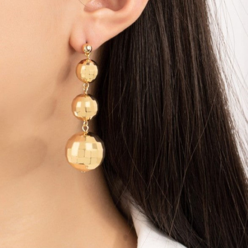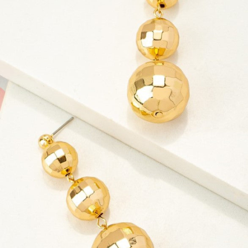 Get groovy with these drop earrings that will take your style to the next level! These Graduate disco balls are sure to add some fun and flair to any outfit. product details0.75″ x 2.5″DropCCB Plastic Shiny gold plating