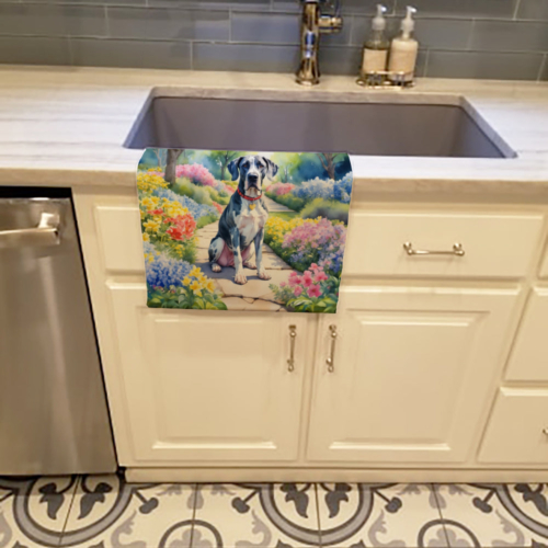 Kitchen Towel featuring breed specific Great Dane artwork. Experience the perfect blend of aesthetic appeal and functional excellence with our Plush Velour Kitchen Towels. These are not your ordinary decorative kitchen towels that gather dust. Instead, they are designed to be as practical as they are stylish. The front layer of our towel is constructed from a minky plush polyester, known for its durability and color retention. Unlike conventional kitchen towels, the artwork on our towels is dyed directly into the fabric, ensuring vibrant colors that last. Polish your glassware to a brilliant sparkle using the plush front side of the towel. Flip to the back, crafted from 100% cotton terry loop, to exploit its exceptional absorbency for drying dishes or wiping down counters. Our kitchen towels redefine the concept of functional art, offering lasting quality that maintains the towel’s shape over time. Measuring 15 inches by 25 inches and weighing 2.3 lbs per dozen, these towels deliver an overwhelming sensory experience with their soft, plush, and smooth texture. The edges are meticulously finished with binding, enhancing their durability and visual appeal. For your convenience, these towels are machine washable and can be dried on low heat. After the first wash, the top fabric becomes even softer and fluffier, eliminating the need for ironing. Treat your kitchen to the luxury and functionality it deserves with our plush velour kitchen towels.