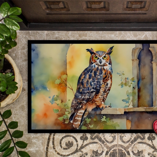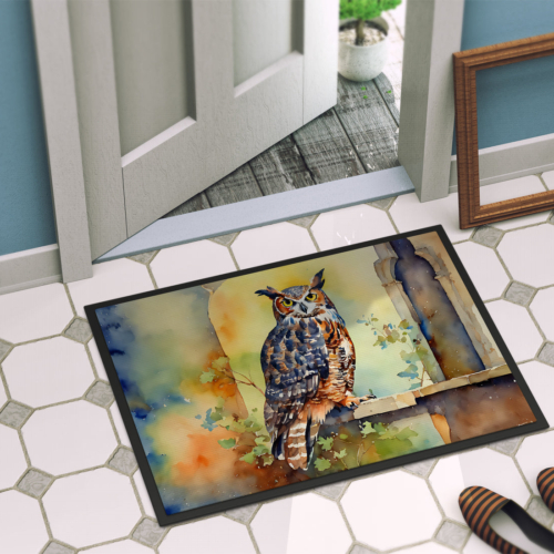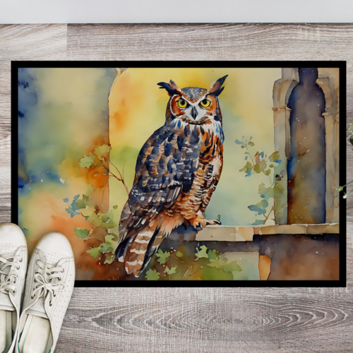 Doormat featuring breed specific Great Horned Owl artwork. Welcome your guests in style with our Artwork Door Mat, designed to withstand almost any weather condition. This mat, measuring approximately 24 by 36 inches, is held together by durable black binding tape. Its top layer, composed of polyester felt, is dyed with the eye-catching image you see on the mat. A few layers below provide the mat with stability, while its rubber bottom is stamped to help prevent slipping and ensures safety. Our mat works wonderfully as both an indoor or outdoor door mat. For cleaning, simply hose it off with water or use a power washer – no need for any cleaner that produces suds. Avoid scrubbing with a brush, instead, opt for the vacuum on floor setting. Designed manufactured and printed in the USA, this mat is a perfect addition to your porch, outdoor kitchen, entryway, or any indoor space. Its unique design makes it a charming decorative rug that greets your guests and adds a stylish touch to your home decor.