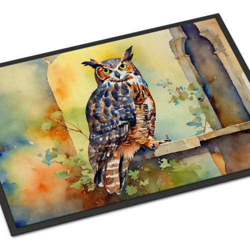 Doormat featuring breed specific Great Horned Owl artwork. Welcome your guests in style with our Artwork Door Mat, designed to withstand almost any weather condition. This mat, measuring approximately 24 by 36 inches, is held together by durable black binding tape. Its top layer, composed of polyester felt, is dyed with the eye-catching image you see on the mat. A few layers below provide the mat with stability, while its rubber bottom is stamped to help prevent slipping and ensures safety. Our mat works wonderfully as both an indoor or outdoor door mat. For cleaning, simply hose it off with water or use a power washer – no need for any cleaner that produces suds. Avoid scrubbing with a brush, instead, opt for the vacuum on floor setting. Designed manufactured and printed in the USA, this mat is a perfect addition to your porch, outdoor kitchen, entryway, or any indoor space. Its unique design makes it a charming decorative rug that greets your guests and adds a stylish touch to your home decor.