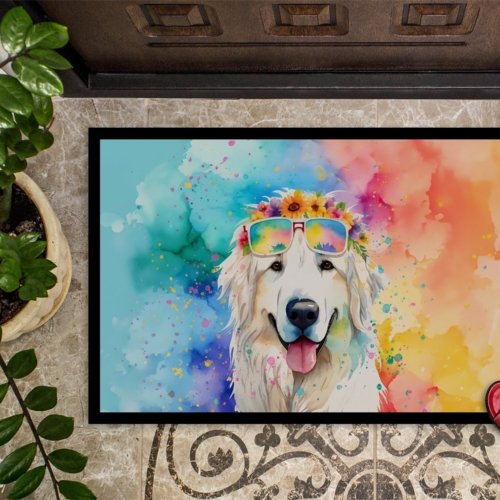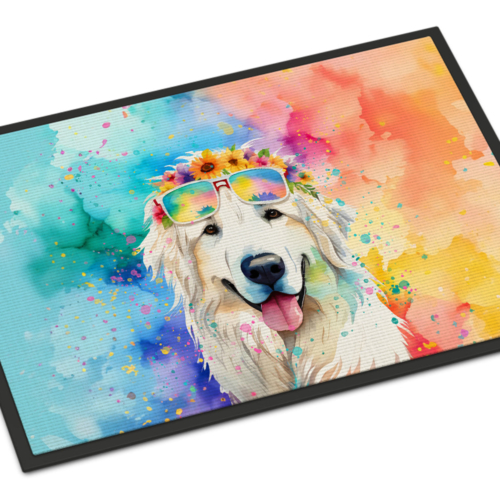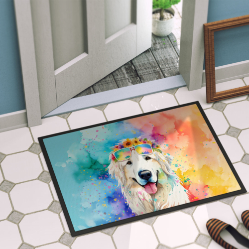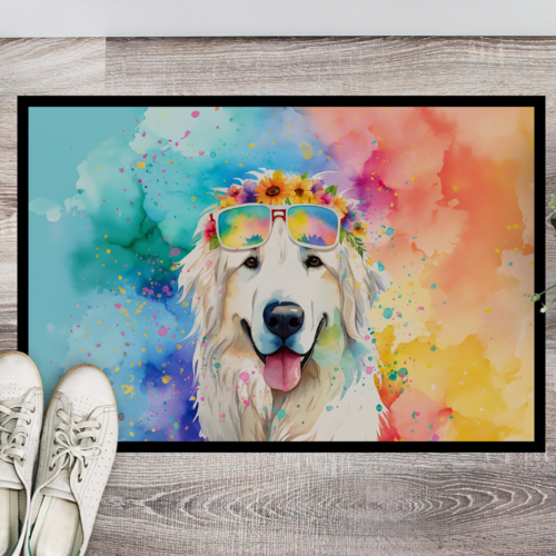 Doormat featuring breed specific Great Pyrenees artwork. Welcome your guests in style with our Artwork Door Mat, designed to withstand almost any weather condition. This mat, measuring approximately 18 by 27 inches, is held together by durable black binding tape. Its top layer, composed of polyester felt, is dyed with the eye-catching image you see on the mat. A few layers below provide the mat with stability, while its rubber bottom is stamped to help prevent slipping and ensures safety. Our mat works wonderfully as both an indoor or outdoor door mat. For cleaning, simply hose it off with water or use a power washer – no need for any cleaner that produces suds. Avoid scrubbing with a brush, instead, opt for the vacuum on floor setting. Designed manufactured and printed in the USA, this mat is a perfect addition to your porch, outdoor kitchen, entryway, or any indoor space. Its unique design makes it a charming decorative rug that greets your guests and adds a stylish touch to your home decor.