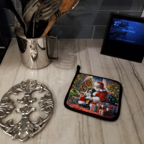 Pair of Pot Holders featuring breed specific Greater Swiss Mountain Dog artwork. Celebrate Christmas with this Christmas Pair of Pot Holders. A Pair of Pot Holders to match your kitchen decor. Made in the USA these are thick and functional. Full color artwork decorates the front polyester fabric of the hot pad and accented by a black trim. Use these at as a trivet for your Thanksgiving or Christmas tablescape. Filled with insulated fabric and quilted for durability. These colorful pot holders will make a great gift for your favorite home cook or executive chef. Each pot holder measures approximately 7 1/2 inches by 7 1/2 inches. A hanging tab is included.