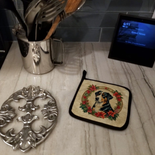 Pair of Pot Holders featuring breed specific Greater Swiss Mountain Dog artwork. Celebrate Christmas with this Christmas Pair of Pot Holders. A Pair of Pot Holders to match your kitchen decor. Made in the USA these are thick and functional. Full color artwork decorates the front polyester fabric of the hot pad and accented by a black trim. Use these at as a trivet for your Thanksgiving or Christmas tablescape. Filled with insulated fabric and quilted for durability. These colorful pot holders will make a great gift for your favorite home cook or executive chef. Each pot holder measures approximately 7 1/2 inches by 7 1/2 inches. A hanging tab is included.