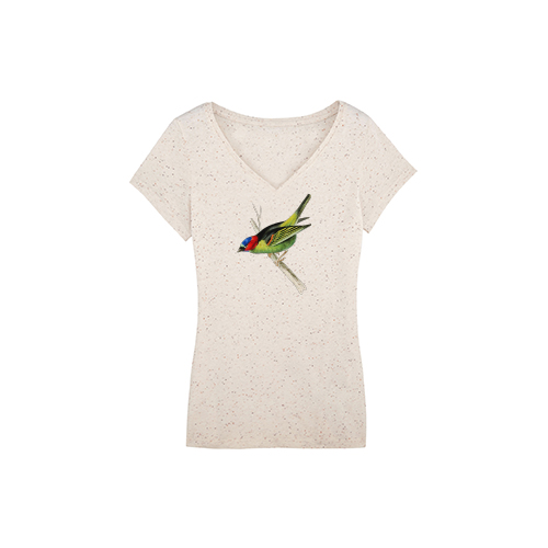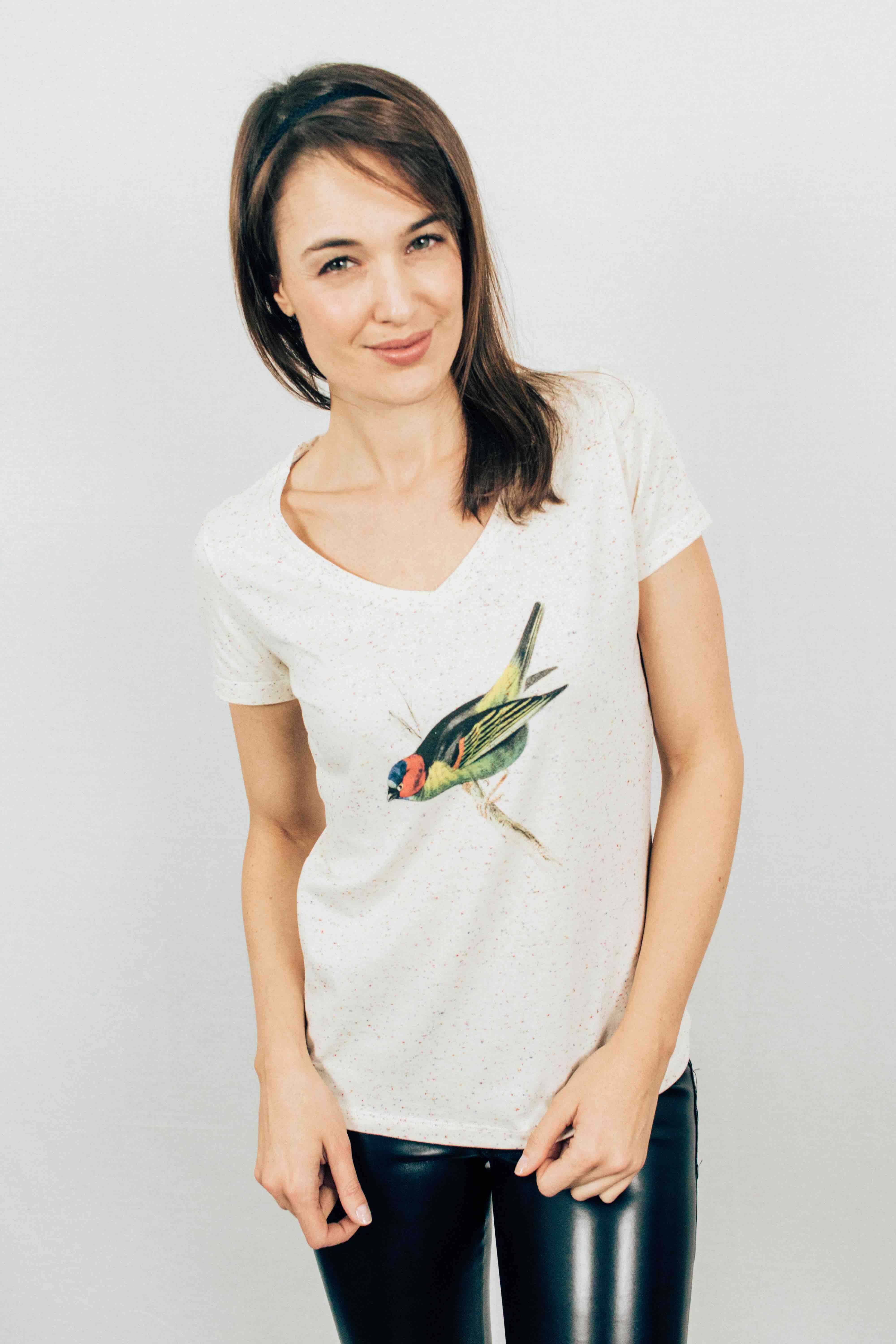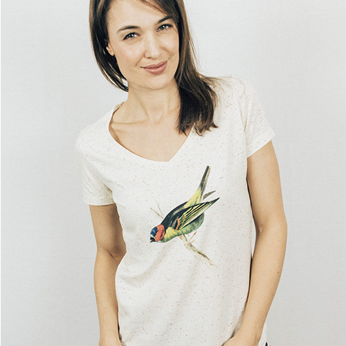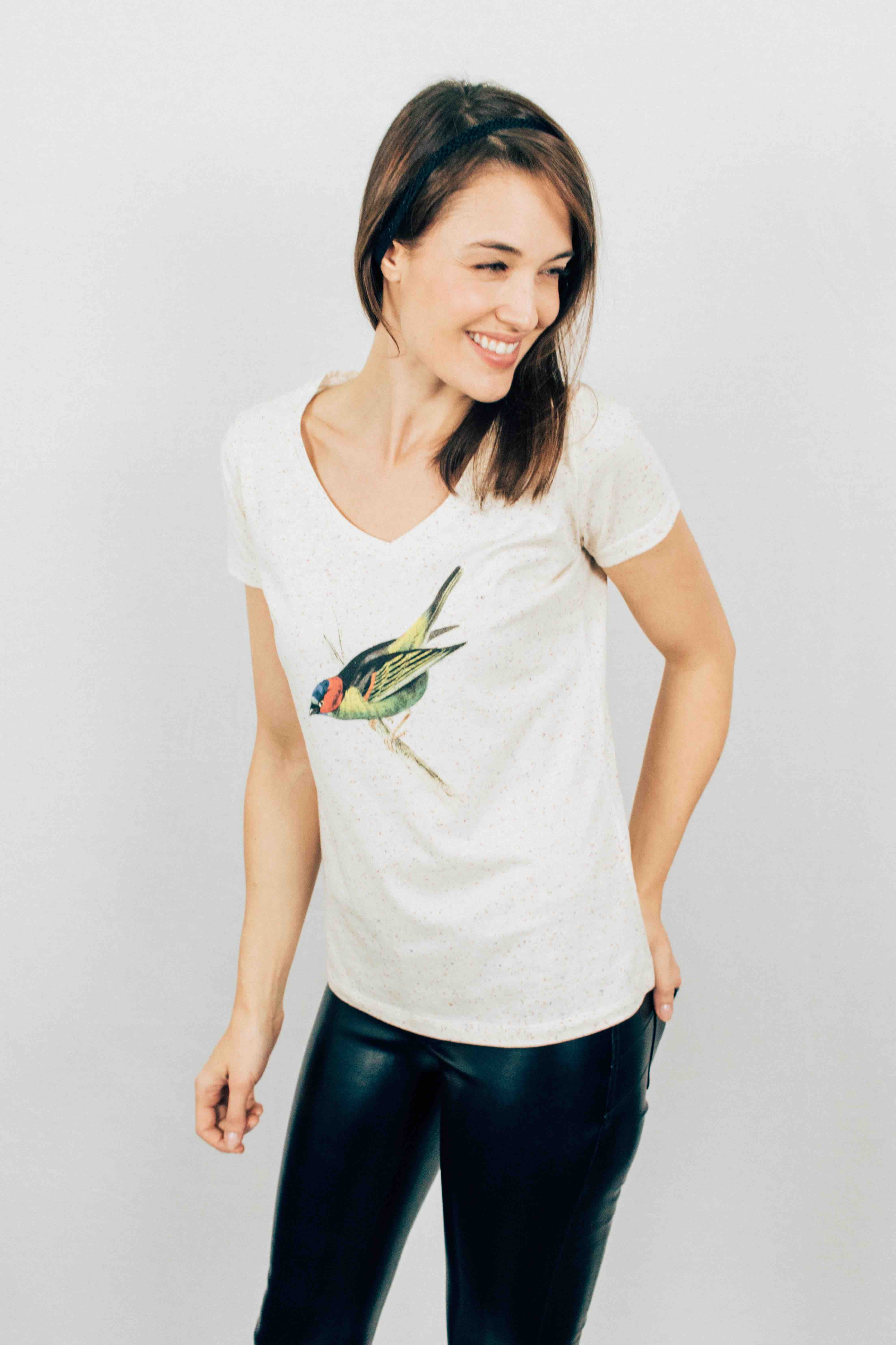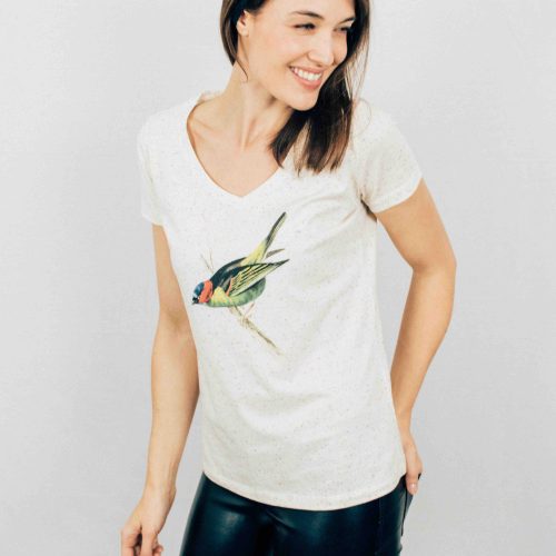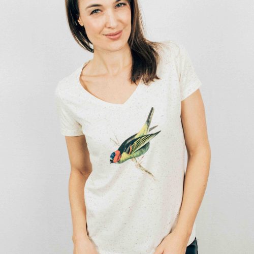 Green Bird V-neck Speckled Tee made of 96% cotton, 4% polyester. Pair it with your favourite jeans and sneakers or a skirt. Features: V neck. Color : cream with multicolor neps. Short sleeves. Regular fit. Model wears Medium size. Model hight: 173cm / 5’8″. Made with love in Portugal and printed in France. Our recommendations: Wash inside out with similar colors at 30°C. Iron inside out at low to medium temperature. No bleaching. Do not iron on decoration directly
