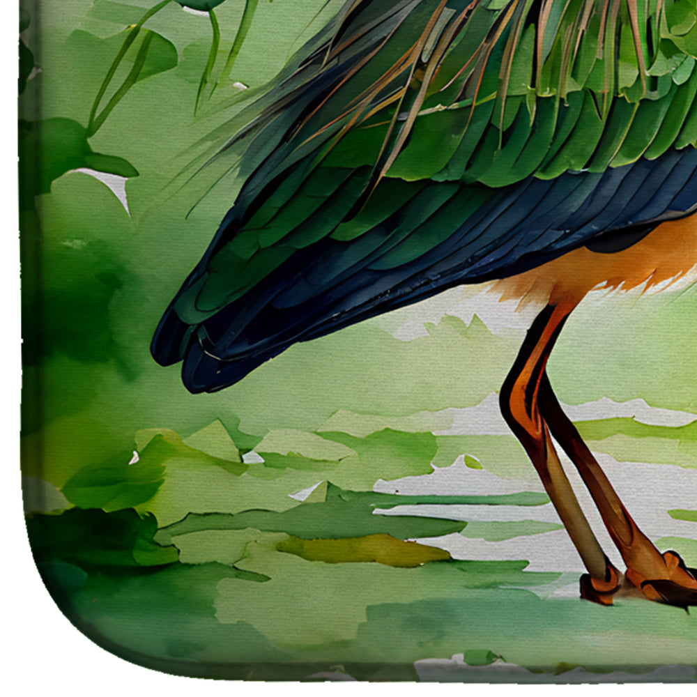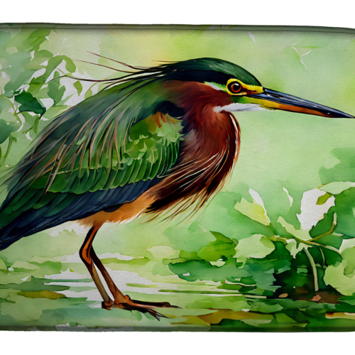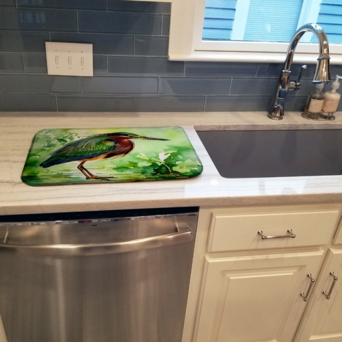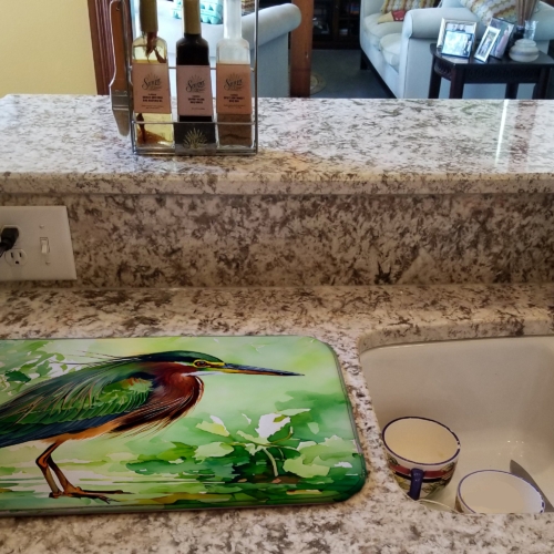 Dish Drying Mat featuring breed specific Green Heron artwork. Say goodbye to messy countertops and soggy dish towels with our innovative dish drying mat. Our high-quality dish drying pad is designed to keep your countertops dry while offering a stylish and efficient solution. Whether you’re air drying dishes, glasses, stemware, silverware, pots, pans, bottles, or even fruits and vegetables, our dish mat is the perfect choice. The 14 inches x 22 inches size fits most counters and dish drying racks, and the non-slip design ensures stability. Made with water-absorbent polyester and a polyurethane foam insert, our dish drying mat is not only functional but also durable. It’s machine washable and printed in the USA for long-lasting use. The beautiful artwork adds flair to your kitchen decor, making it a perfect housewarming gift or present for any occasion. Upgrade your kitchen experience with our absorbent and versatile dish drying mat.