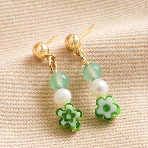 Featuring a post suspending three unique beads, each earring holds a seafoam green faceted bead, a shining freshwater pearl and a sweet green flower. Each of these beads is suspended from a gold ball stud for a touch of shine. Fastening via hypoallergenic sterling silver posts and butterfly backs, these lightweight drop studs would look amazing in a curated ear look. Pair them with other playful accessories for a true summer feel. Dimensionswidth 4mm x height 22mm x depth 4mmMade from14ct gold plated brass, glass, freshwater pearl, sterling silver posts