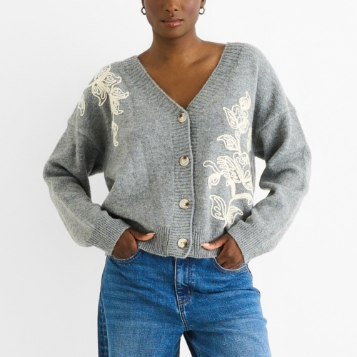 This Grey Floral Appliqué Wool Mix Cardigan offers a perfect blend of comfort and bold style. Crafted from a soft wool mix, it keeps you warm while the striking floral appliqué adds a creative edge to your casual wardrobe. Ideal for those who want to stay cozy without compromising on standout fashion.