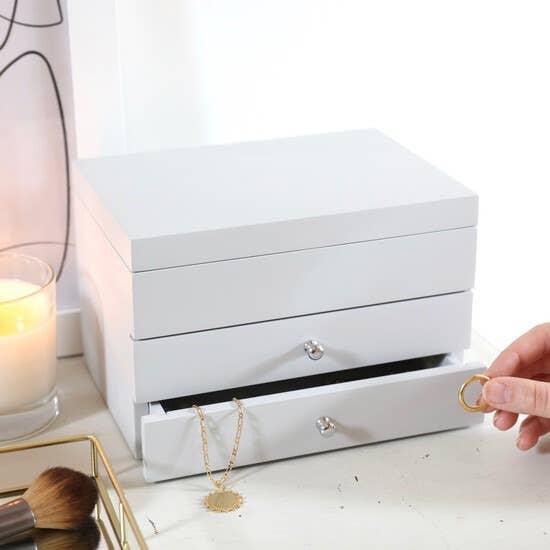Width 21cm x height 13.5cm x depth 15cm lid compartment (x4) – 6cm x height 30mm x depth 6cm drawer inner – width 18cm x height 15mm x depth 12.5cm.Material: Wood.