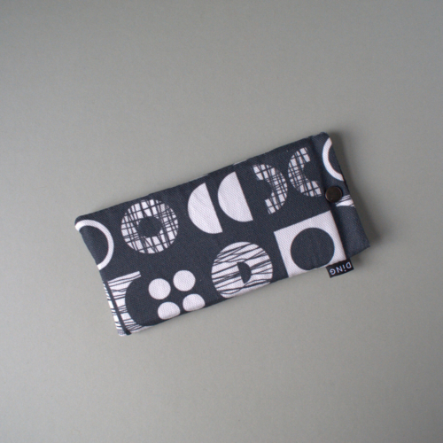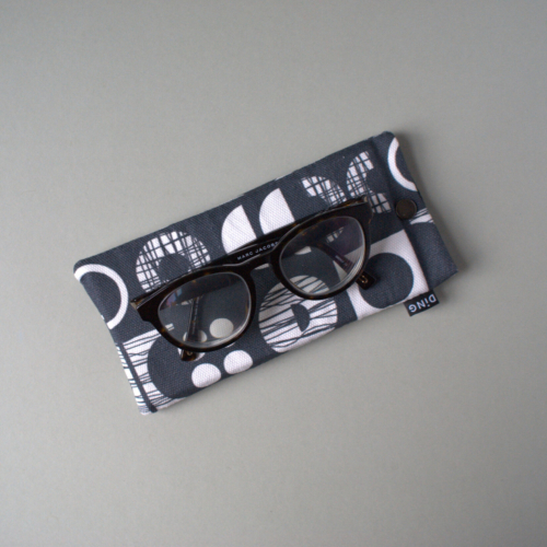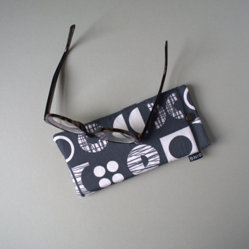 Grey and white ‘Monument’ pattern protective case for spectacles and sun glasses, made from 340gsm cotton hopsack, 5mm thick dense foam and soft black cotton lining, a brass press stud keeps your glasses in place. This case is super protective, great for reading glasses, sunglasses, fashion eyewear, spectacles and available in lots of retro, mid-century inspired, geometric patterns.