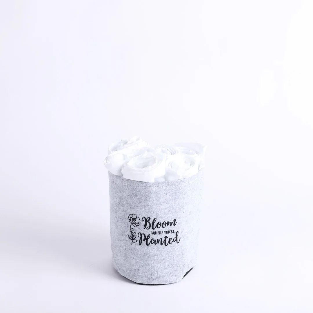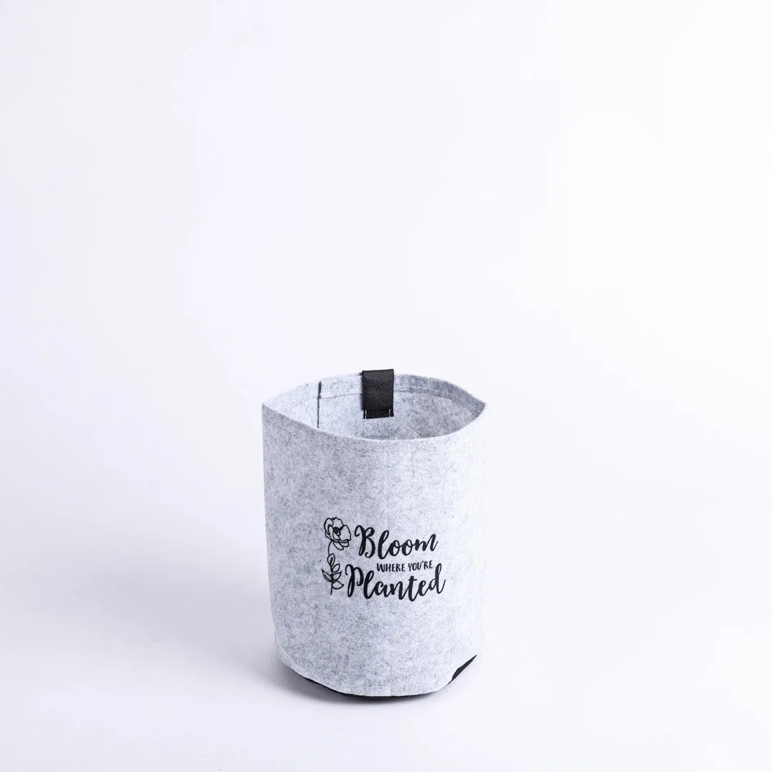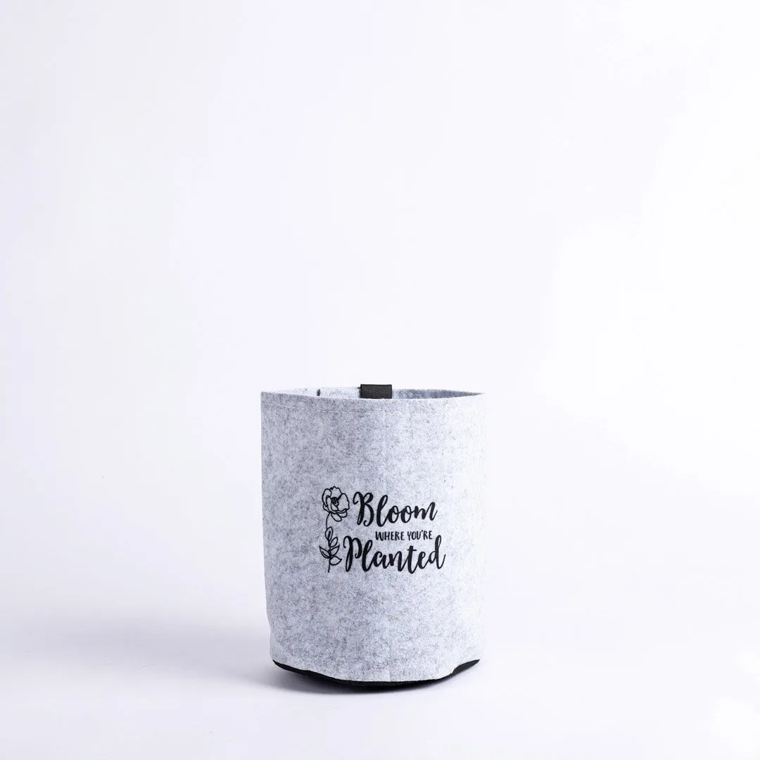 But the Bloom Grow Bag isn’t just for plants! Its sleek gray color and convenient Velcro back design make it perfect for a variety of uses around the house. Itís a great option for organizing craft supplies, extra blankets, or even for storing those ever-tangled charging cords. The versatile design also makes it an excellent way to update and decorate old planters, giving them a fresh, new look with a bright and uplifting Bloom message.