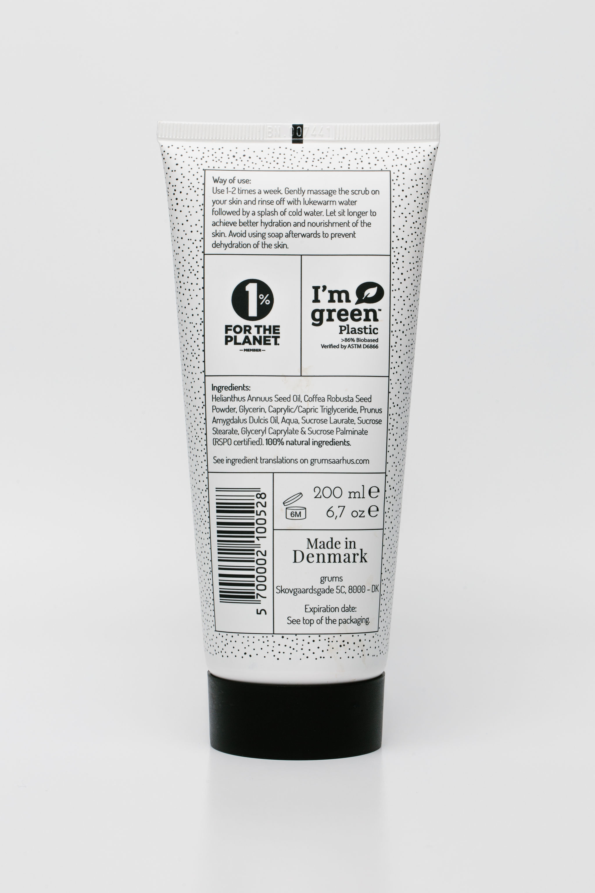 • Way of use: Use morning or evening, 1-2 times a week. Massage an appropriate amount on your body and exfoliate gently. On really dry areas you can leave the scrub on for a couple of minutes. Rinse thoroughly with temperate water and a splash of cold water afterwards.