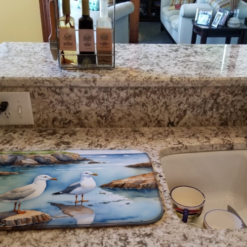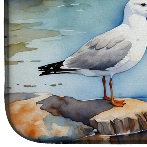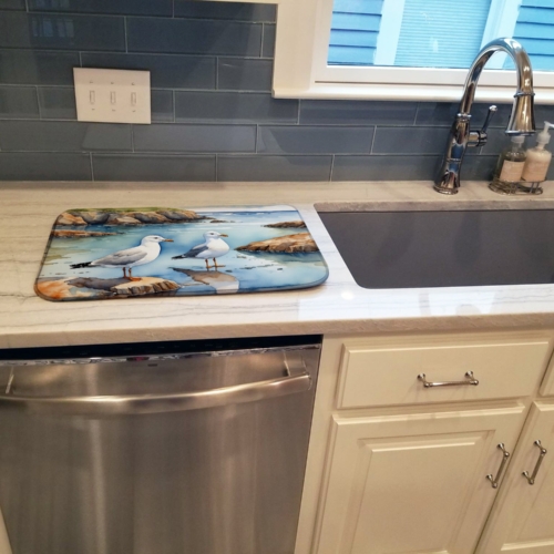 Dish Drying Mat featuring breed specific Gull artwork. Say goodbye to messy countertops and soggy dish towels with our innovative dish drying mat. Our high-quality dish drying pad is designed to keep your countertops dry while offering a stylish and efficient solution. Whether you’re air drying dishes, glasses, stemware, silverware, pots, pans, bottles, or even fruits and vegetables, our dish mat is the perfect choice. The 14 inches x 22 inches size fits most counters and dish drying racks, and the non-slip design ensures stability. Made with water-absorbent polyester and a polyurethane foam insert, our dish drying mat is not only functional but also durable. It’s machine washable and printed in the USA for long-lasting use. The beautiful artwork adds flair to your kitchen decor, making it a perfect housewarming gift or present for any occasion. Upgrade your kitchen experience with our absorbent and versatile dish drying mat.