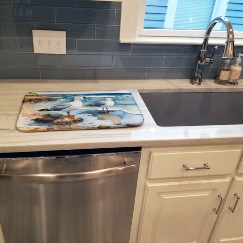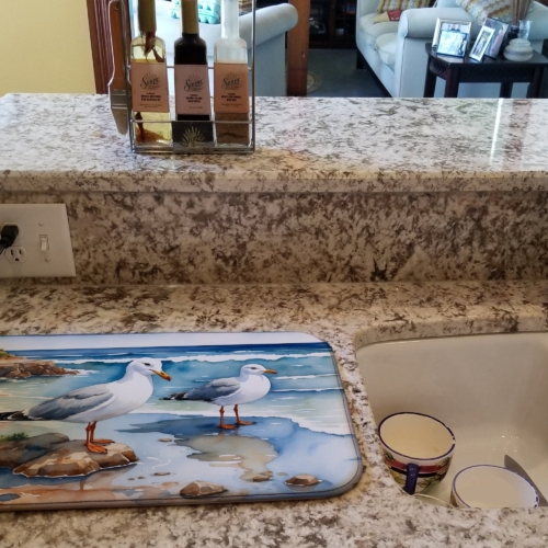 Dish Drying Mat featuring breed specific Gull artwork. Say goodbye to messy countertops and soggy dish towels with our innovative dish drying mat. Our high-quality dish drying pad is designed to keep your countertops dry while offering a stylish and efficient solution. Whether you’re air drying dishes, glasses, stemware, silverware, pots, pans, bottles, or even fruits and vegetables, our dish mat is the perfect choice. The 14 inches x 22 inches size fits most counters and dish drying racks, and the non-slip design ensures stability. Made with water-absorbent polyester and a polyurethane foam insert, our dish drying mat is not only functional but also durable. It’s machine washable and printed in the USA for long-lasting use. The beautiful artwork adds flair to your kitchen decor, making it a perfect housewarming gift or present for any occasion. Upgrade your kitchen experience with our absorbent and versatile dish drying mat.
