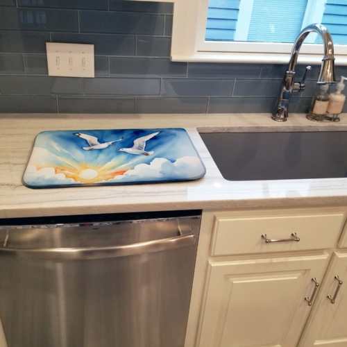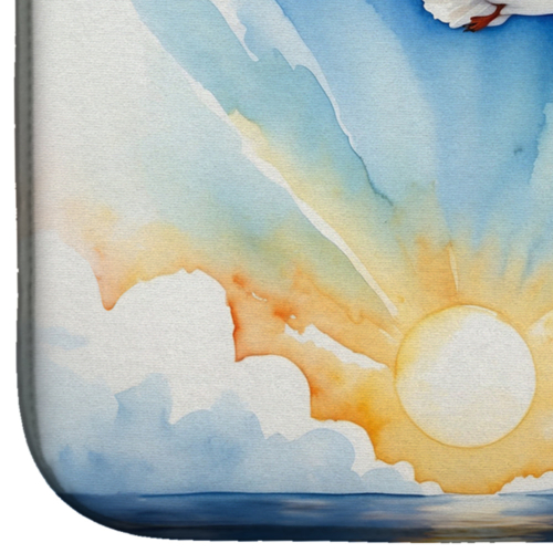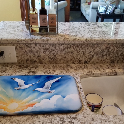 Dish Drying Mat featuring breed specific Gull artwork. Say goodbye to messy countertops and soggy dish towels with our innovative dish drying mat. Our high-quality dish drying pad is designed to keep your countertops dry while offering a stylish and efficient solution. Whether you’re air drying dishes, glasses, stemware, silverware, pots, pans, bottles, or even fruits and vegetables, our dish mat is the perfect choice. The 14 inches x 22 inches size fits most counters and dish drying racks, and the non-slip design ensures stability. Made with water-absorbent polyester and a polyurethane foam insert, our dish drying mat is not only functional but also durable. It’s machine washable and printed in the USA for long-lasting use. The beautiful artwork adds flair to your kitchen decor, making it a perfect housewarming gift or present for any occasion. Upgrade your kitchen experience with our absorbent and versatile dish drying mat.