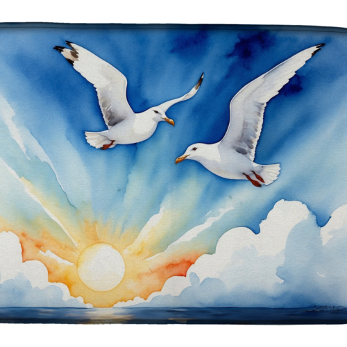 Dish Drying Mat featuring breed specific Gull artwork. Say goodbye to messy countertops and soggy dish towels with our innovative dish drying mat. Our high-quality dish drying pad is designed to keep your countertops dry while offering a stylish and efficient solution. Whether you’re air drying dishes, glasses, stemware, silverware, pots, pans, bottles, or even fruits and vegetables, our dish mat is the perfect choice. The 14 inches x 22 inches size fits most counters and dish drying racks, and the non-slip design ensures stability. Made with water-absorbent polyester and a polyurethane foam insert, our dish drying mat is not only functional but also durable. It’s machine washable and printed in the USA for long-lasting use. The beautiful artwork adds flair to your kitchen decor, making it a perfect housewarming gift or present for any occasion. Upgrade your kitchen experience with our absorbent and versatile dish drying mat.