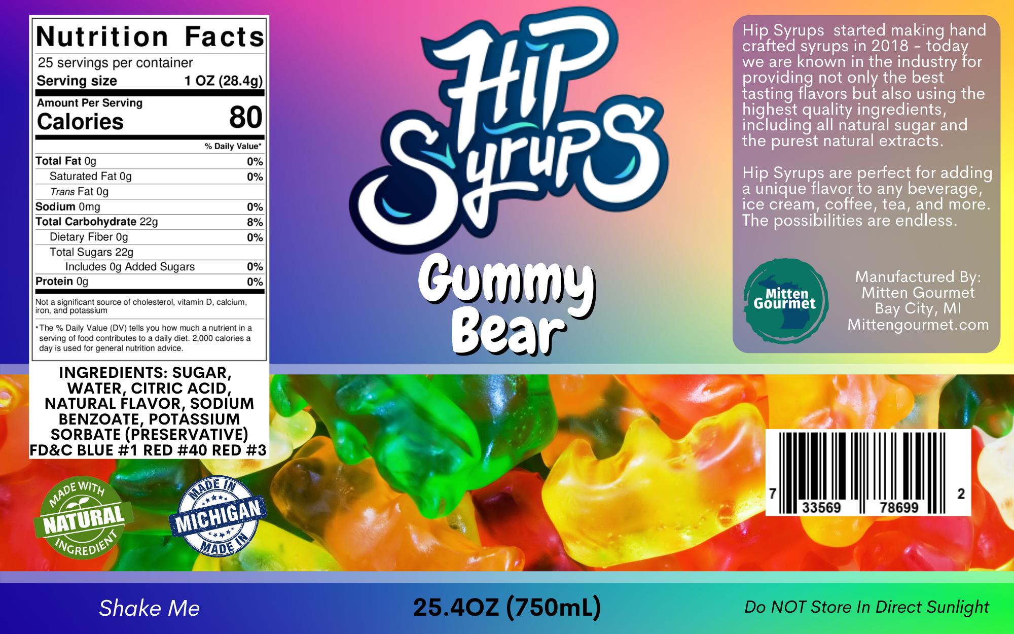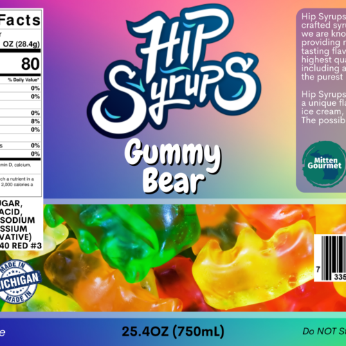 Natural flavoring, that comes in sugar or sugar-free! Ideal for your water, tea, smoothies, shakes, and much more! All products are handcrafted & made right in Michigan! This handcrafted Gummy bear Hip Syrup is Crafted to taste like Your favorite Raspberry, lemon, pineapple, strawberry, and orange gummy candies.