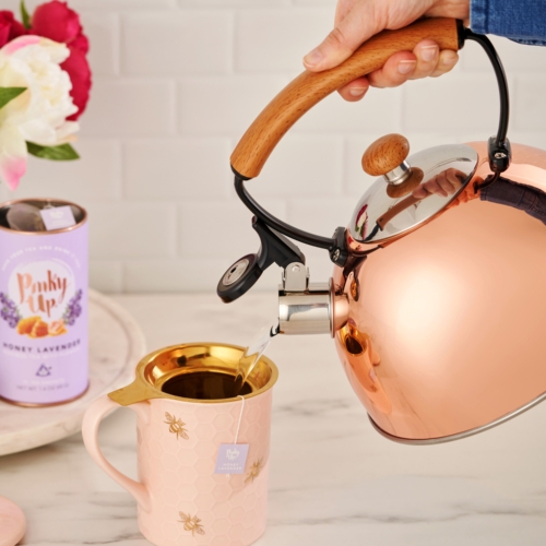 Experience the perfect blend of tradition and modern design. This 70 oz stove kettle is crafted with stainless steel with a stylish finish. Designed with an ergonomic, heat-resistant bamboo handle and push-button spout for effortless pouring, this kettle whistles to signal when your water is ready. Suitable for all stovetop types, it’s a functional and beautiful addition to any kitchen. 70 oz capacity for large servings Whistles to alert when water boils Works on all cooking surfaces Durable stainless steel construction Stylish polish finish with bamboo handle
