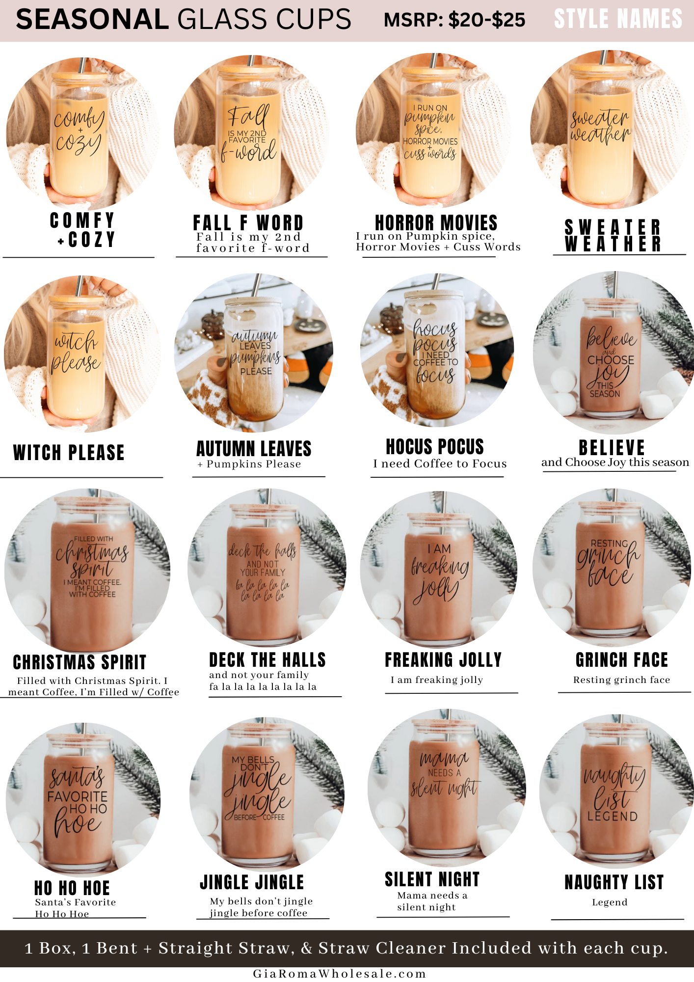 All of our seasonal styles on one listing! Choose your style and get ready to sell. You don’t just get the cup you choose, but also: 1 Bamboo Top, 1 Bent & Straight Metal Straw, 1 Straw Cleaner & 1 white unmarked box for each cup.