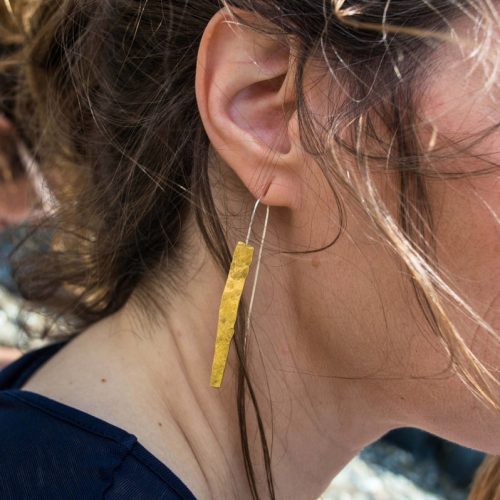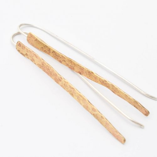 Large plannished brass and eco-silver earrings in an elegant shard shape for a stylish minimalist feel: the irregular rectangle is around 10mm x 60mm and the wire drop is around 10mm. They’re quite noticeable, simple, statement earrings that seem to go with everything. They’re also available in all eco-silver and antique silver (which is oxidised so looks darker and more textured-looking).All my jewellery is gift-wrapped in tissue or recycled card giftboxes.What is ecosilver? Eco-silver is a green alternative to sterling silver. It is a little bit more expensive but has the same silver content as sterling, it’s just made of 100% recycled and scrap silver products. Eco Silver can be both treated and worked with in the same way as silver, for the same quality results but more environmentally friendly. Produced from scrap jewellery, medical equipment, electronics and giftware, all the eco silver I use comes with a certificate of authenticity and is hallmarked if it is the required weight.