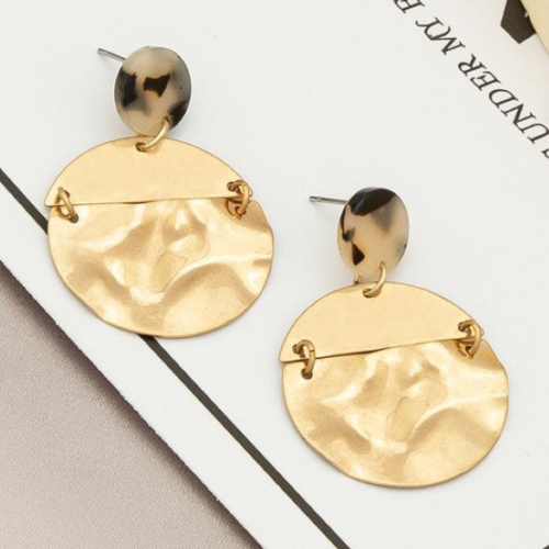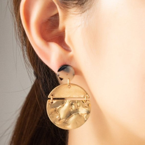Add a touch of whimsy to your look with these hammered circle drop earrings. The unique texture is sure to catch the eye, elevating any outfit. These earrings are the perfect playful addition to your jewelry collection. (Don’t miss out on this funky style!) product details1.1″ x 1.5″Post back dropIronWorn gold plating