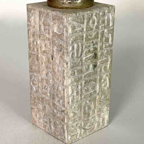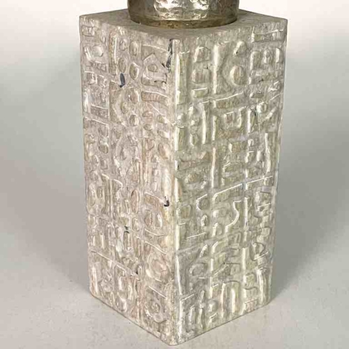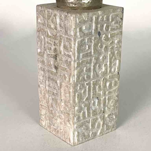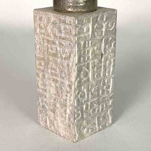 This original work of art was created by a skilled Vietnamese artisan following the design of an accomplished Japanese designer. This white soapstone is the natural color of the stone, unpainted, not dyed. Each piece is carved of a single, solid piece of stone. It is common for this stone to have naturally occurring occlusions which can appear as imperfections. It is these occlusions that give this naturally occurring stone its appeal. Soapstone is a soft rock that is capable of being carved and etched to great deal without fracturing. It is mined in the mountains of Quang Ninh in northern Viet Nam. Each hand-carved object is a symbol of both the aesthetics and talent of the Vietnamese artisans. The soapstone is designed and carved to produce a complete masterpiece. It takes hours to finish ultimately to become a one of a kind piece, truly a reflexion of the character of Vietnam you cannot find anywhere else. Though it is rock, the soapstone is fragile and will break if it is dropped. It will be shipped to you in a box surrounded by bubble-wrap to ensure its safety. This sculptural object measures 12.8 x 5.4 x 5.4 cm (5 x 2.1 x 2.1″)