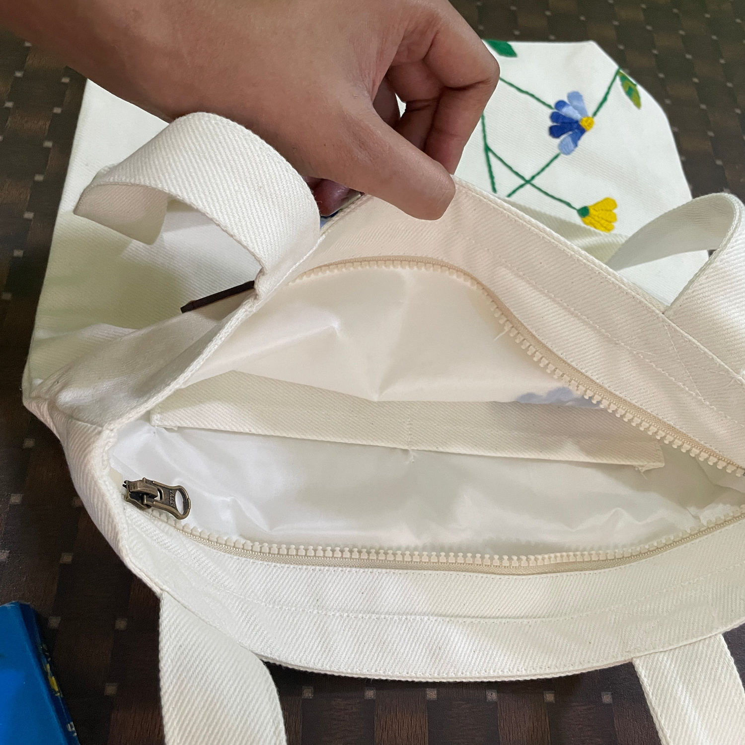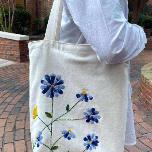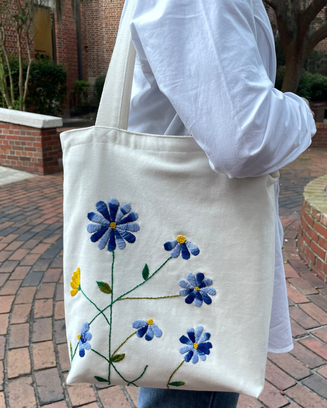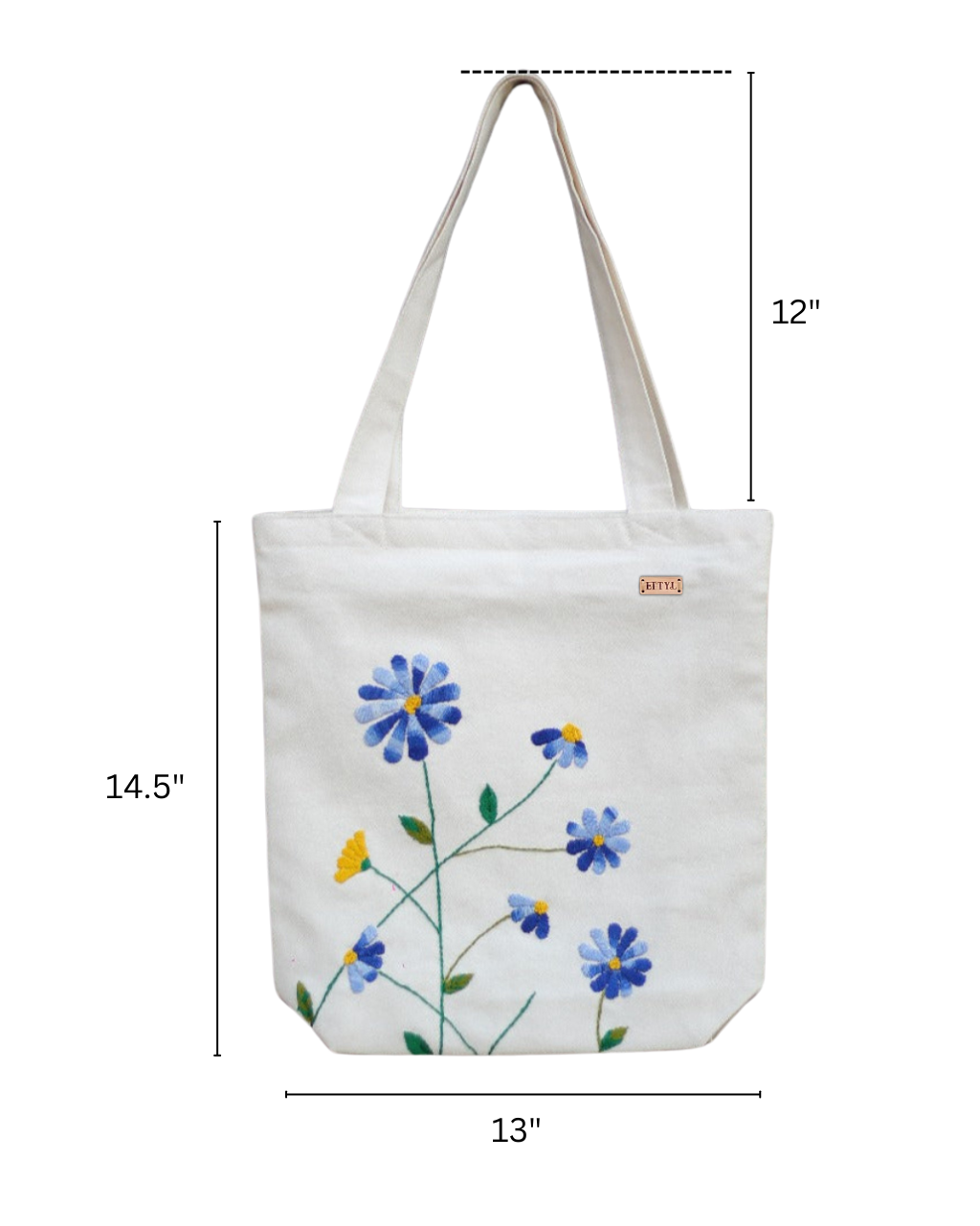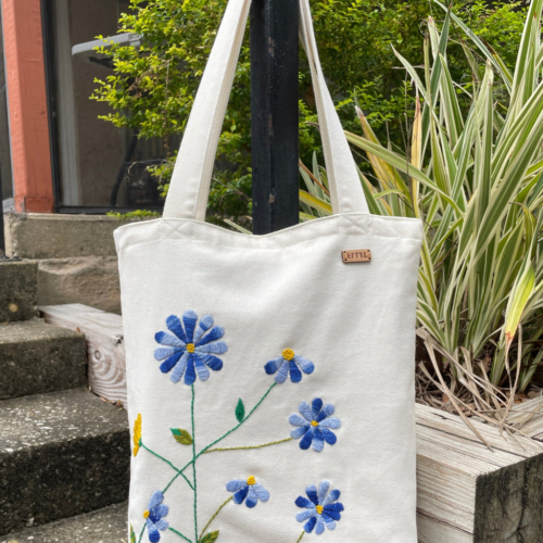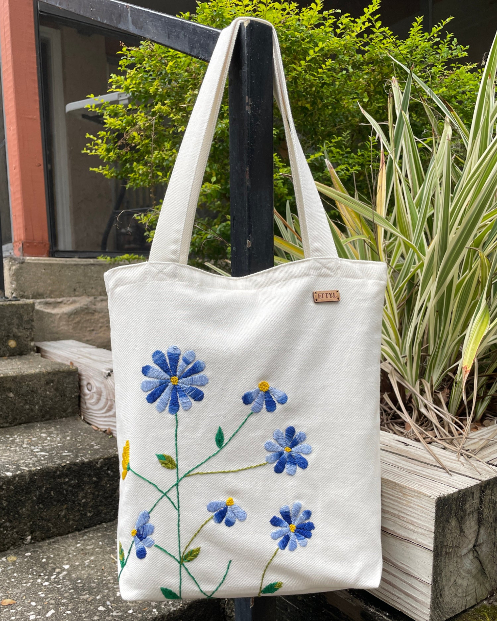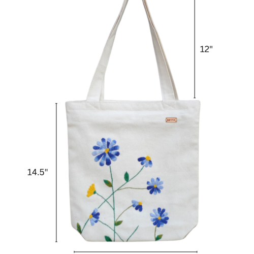 Description Expertly crafted from eco-friendly, vegan materials, this hand-embroidered waterproof tote is made for the fashion-forward woman who treasures nature’s beauty. Adorned with a delicate, hand-stitched blue flower accented with soft yellow details, this tote brings a fresh, serene charm to your everyday style. Designed with convenience in mind, it features inner pockets and a secure zipper closure to keep your cellphone and essentials neatly organized. Made from 100% premium cotton fabric and world-renowned DMC threads, it beautifully blends artisanal craftsmanship with sustainable living. Effortlessly chic and consciously created, this tote is the perfect accessory to celebrate your love for nature while making a positive impact. Product details *Due to its handmade nature, slight variations in color & size are expected. Features: Hand-embroidered by female artisans; Waterproof inner lining; Inner pockets; Zipper closure; Eco-friendly; Vegan; Lightweight; Made of biodegradable material.Main Materials: Cotton fabric & DMC thread. Waterproof: Yes Inner Pockets: Yes Closure Type: Zipper Number of Handles/Straps: Two Weight (w/o box): 0.6 lb. Size: Height – 14.5″ (without handles) and 26.5″ (with handles); Width – 13″ Care: Hand wash with cold water and a mild detergent; No machine wash Country of Origin: Bangladesh View our Return & Refund Policy
