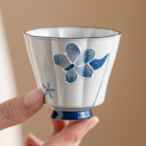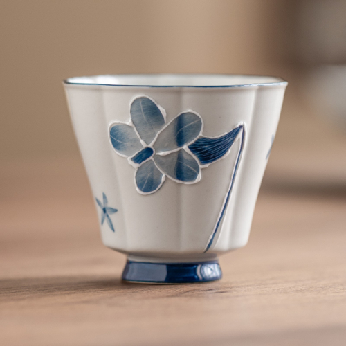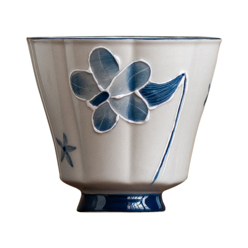 This small teacup is delicately adorned with a hand-painted lily in raised relief, giving the flower a lifelike depth and texture. The lily, a symbol of purity and renewal, is captured in elegant brushstrokes with subtle detailing that brings out its natural grace. Crafted from fine ceramic, the cup combines artistry and function — perfect for savoring tea in a mindful, serene moment. A refined piece that brings beauty and tranquility to your tea rituals.