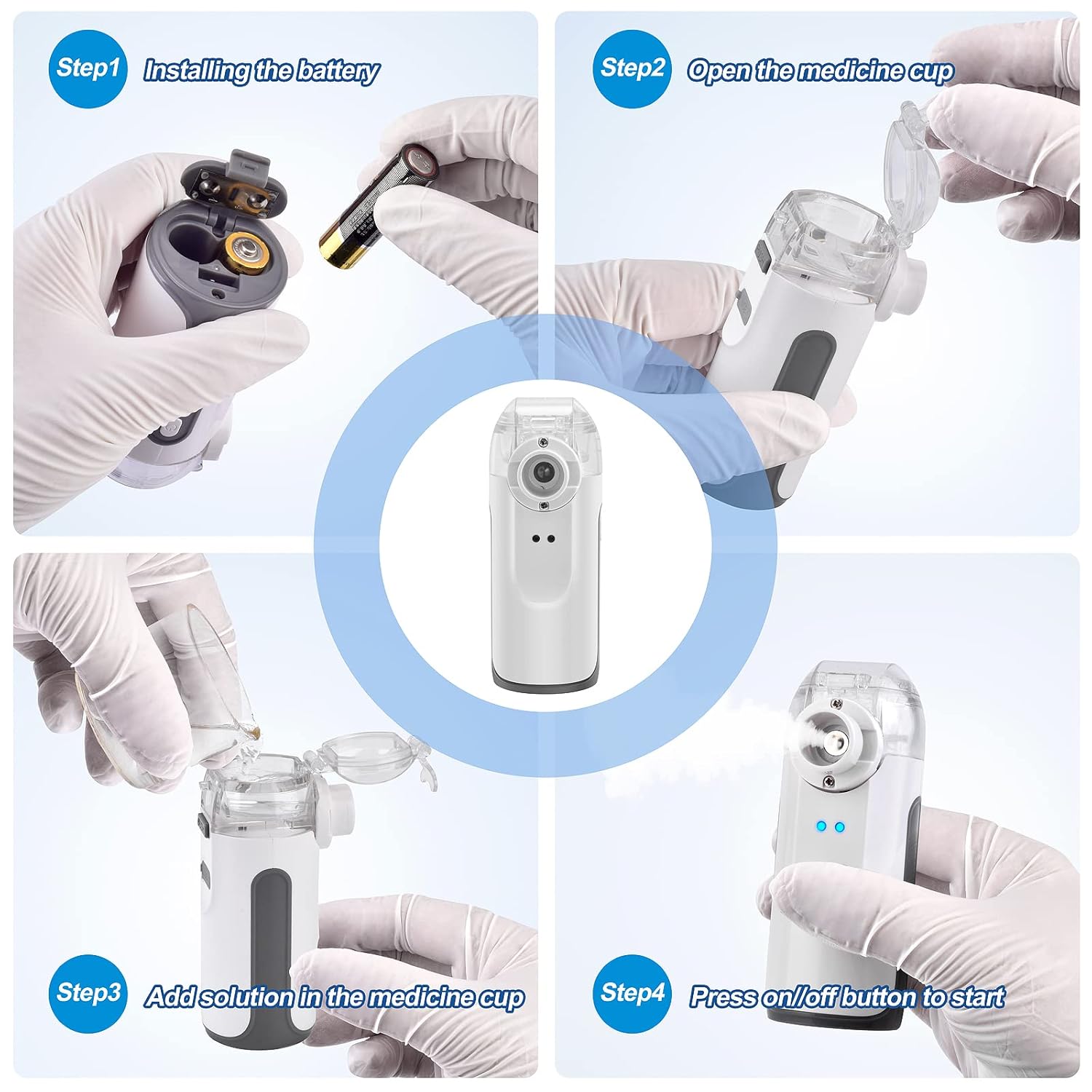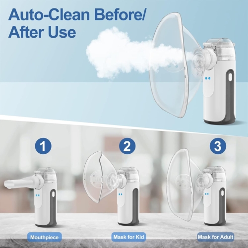 【Help You Remain Active】The fear of having a respiratory attack can make you avoid social situations that you would otherwise love to attend. Having a nebulizer with you at all times can get you out of the house and back into life.【Mesh Technology】The machine adopts advanced mesh technology, with 2800 micro holes in a smaller area. This micro holes can continuously produce more and softer mist (particle size ≤5μm) to help you absorb better.【Improve Your Long-Term Health】Nebulizer machine can be used as a preventive medicine to protect your health.This compact nebulizer is perfect for on-the-go use, easily fitting into your pocket for travel convenience. The nebulizer comes with three accessories – an adult cover, a child cover, and a mouthpiece – making it suitable for all ages and ensuring a comfortable experience for everyone.【Self-Cleaning Mode】Long press 5s to turn on the self-cleaning mode(Green lights are on), which can be used for daily cleaning to avoid clogging, and portable nebulizer run smoothly under any circumstances.The portable inhaler adopts the detachable medicine cup design, which is convenient to clean the remaining medicine residue in the medicine cup.【Easy to Use – Input】Powered by two AA batteries or USB cable to make it work.quiet running: ≤25 dB.It is perfect for home use.which is whispered so that babies and toddlers can sleep well when using it. Also, this baby nebulizer is equipped with an efficient AI Chip to ensure stable nebulization and weighs only 0.25lb, and can be easily handheld by children while sitting or lying down.