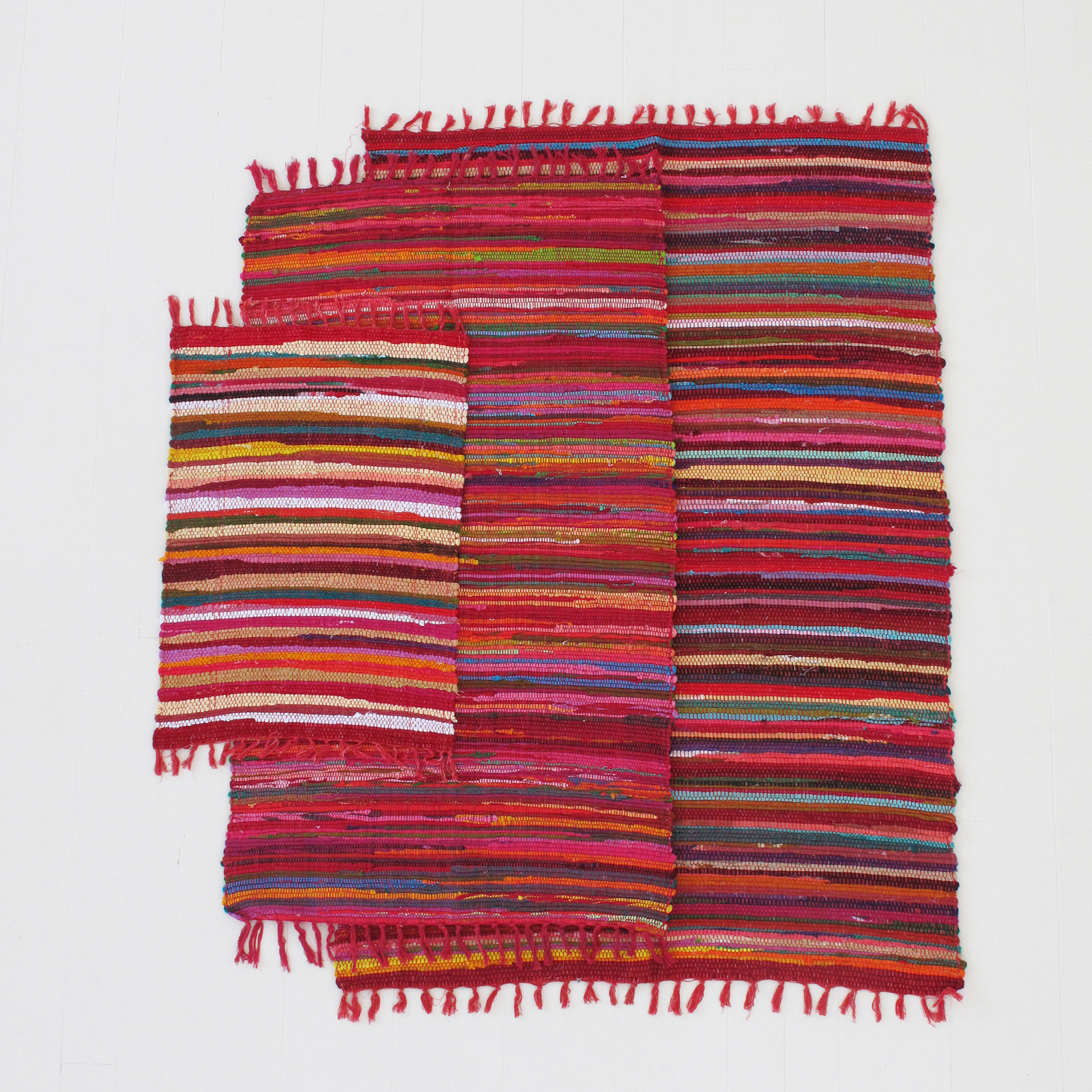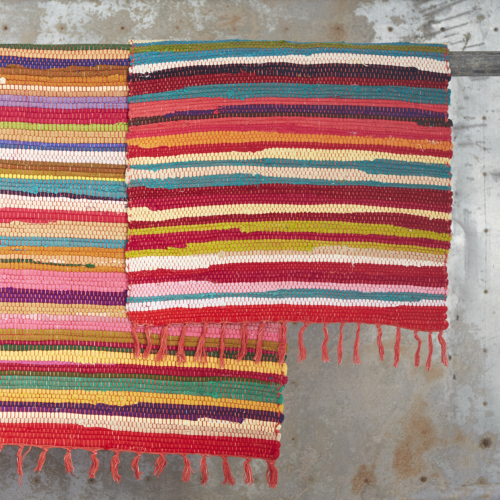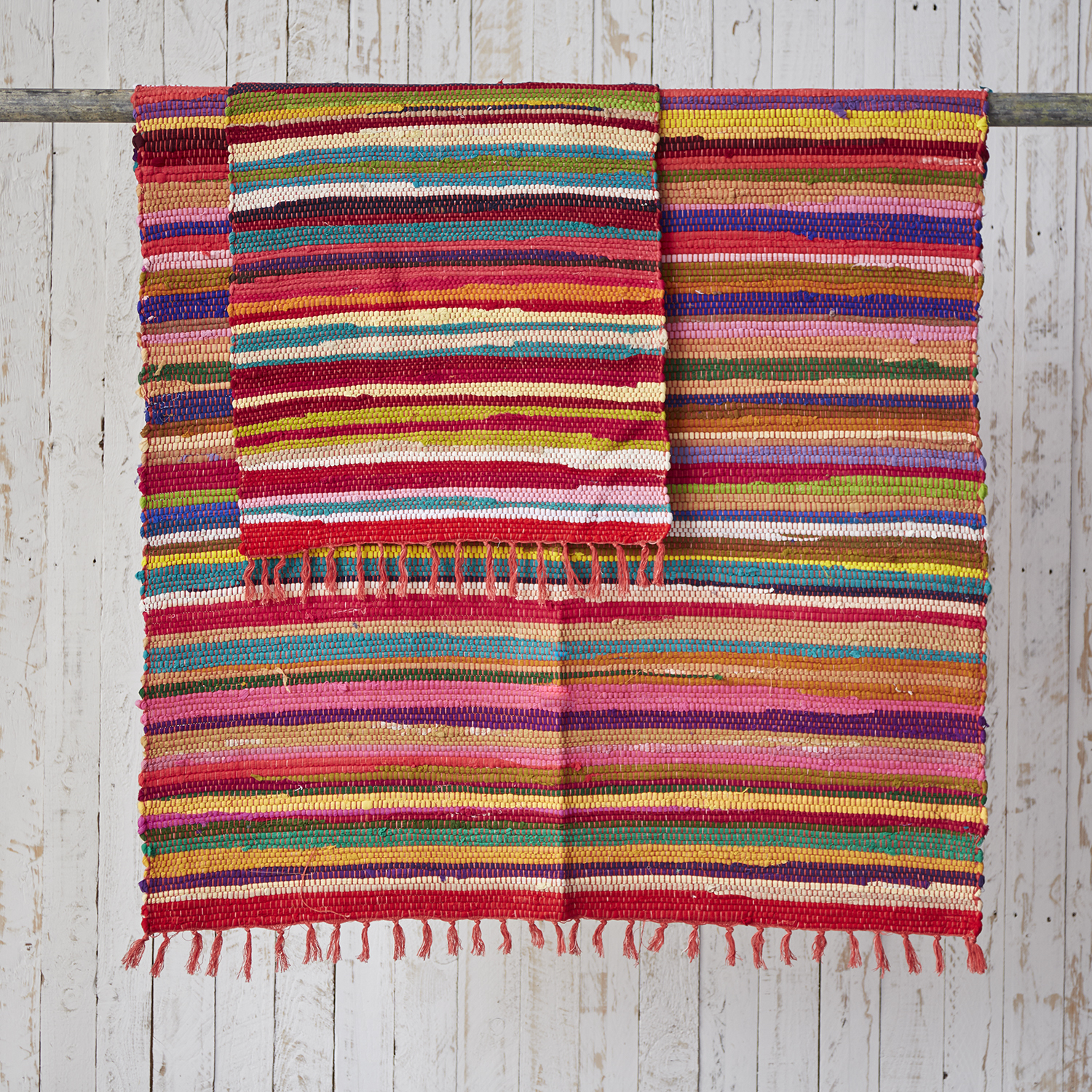 Our soft, vibrant rugs have been hand crafted from recycled cotton rags salvaged from the waste of the Indian garment industry. These rugs have a reversible design and can be machine washed. Brighten up your home and garden with this sustainable style staple._x000D__x000D_Approx. dimensions: _x000D_L 180 × 120 cm_x000D_M 155 × 90 cm_x000D_S 90 × 60 cm_x000D_Runner 240 × 75 cm_x000D__x000D_Can be used as an outdoor rug in dry weather only. Please bring them inside when not in use._x000D__x000D_Pre-wash our non-colourfast rugs before use. Use an anti-slip underlay when placing the rugs on light-coloured carpets or hard floors. Professional dry cleaning is recommended, but machine washing on a cold or handwash setting is also suitable. Do not tumble dry._x000D__x000D_To extend your rug’s lifespan, regularly remove embedded dirt. If colours fade, flip it over for a fresh look – the design is reversible._x000D__x000D_Due to the handmade nature of our products each one is unique, but loveliness comes as standard._x000D__x000D_Made from the discarded offcuts of the massive garment industry in India by an NGO devoted to promoting wasteland development, women’s empowerment in rural areas and the fair treatment of its artisans, these rugs represent a new way to create sustainable products that not only look good, but do good too._x000D__x000D_Individually hand loomed they are also made to last so that each and every rug is made with the same care, attention and skill as brand new rugs that come from the same makers. You can be sure that these ‘recycled’ rugs will not only add a touch of vibrant colour to your home, but will do so for years to come.