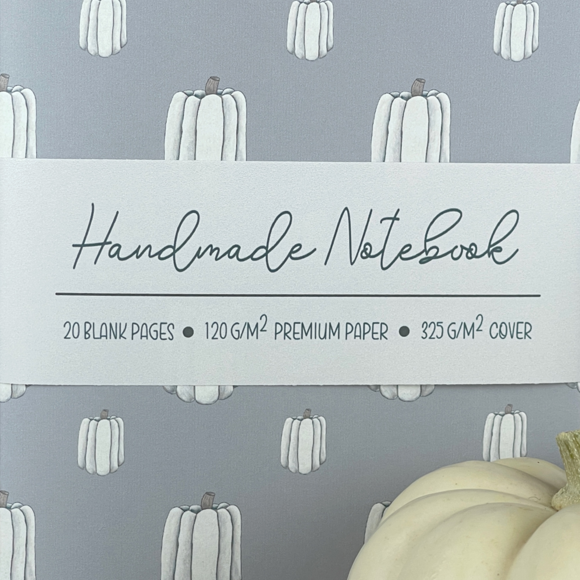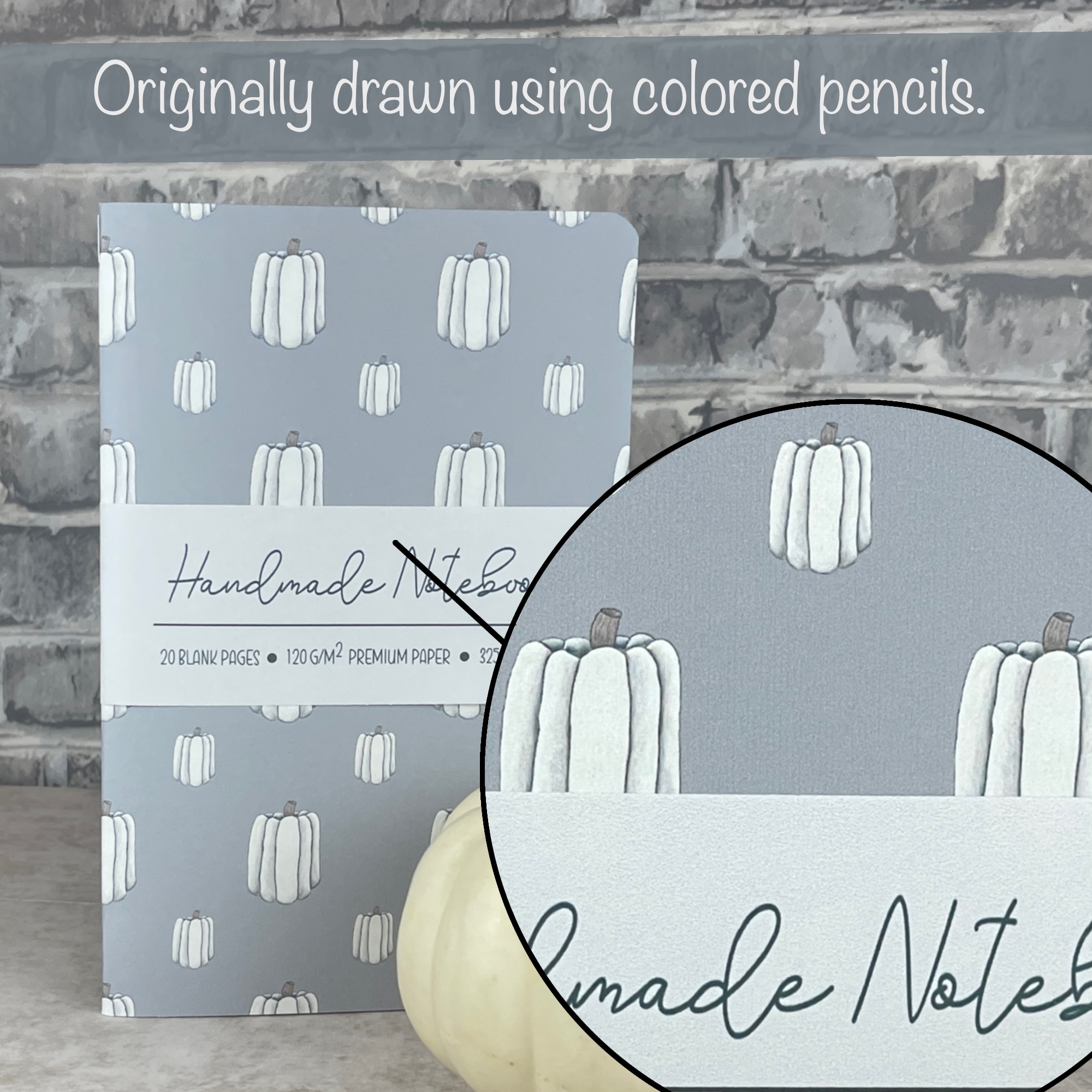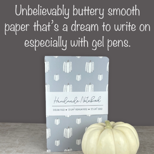 This handmade notebook is the perfect size to take with you on the go – 8″ x 5.25″ (A5 ish sized) so you can toss it in your backpack or purse to have with you all the time. Made with premium materials for a luxurious writing experience, the notebook features 20 blank pages of buttery-smooth 120 GSM paper and a durable 325 GSM cover. The rounded corners and beautiful artwork featuring white pumpkins in two different sizes arranged in a vertical pattern add an extra touch of sophistication. It has a light blue cover. It is also available in white and green. It comes wrapped in a belly band and packaged in a cello bag or shrink-wrapped for shipping. Get yours now to celebrate the spooky season all fall long, or purchase in bundles for even more savings!