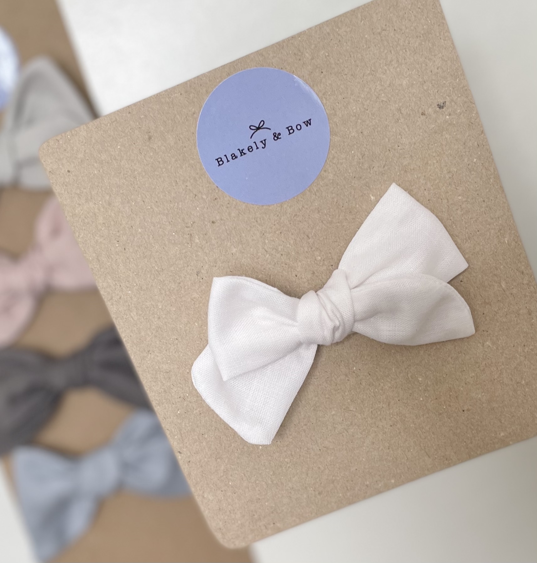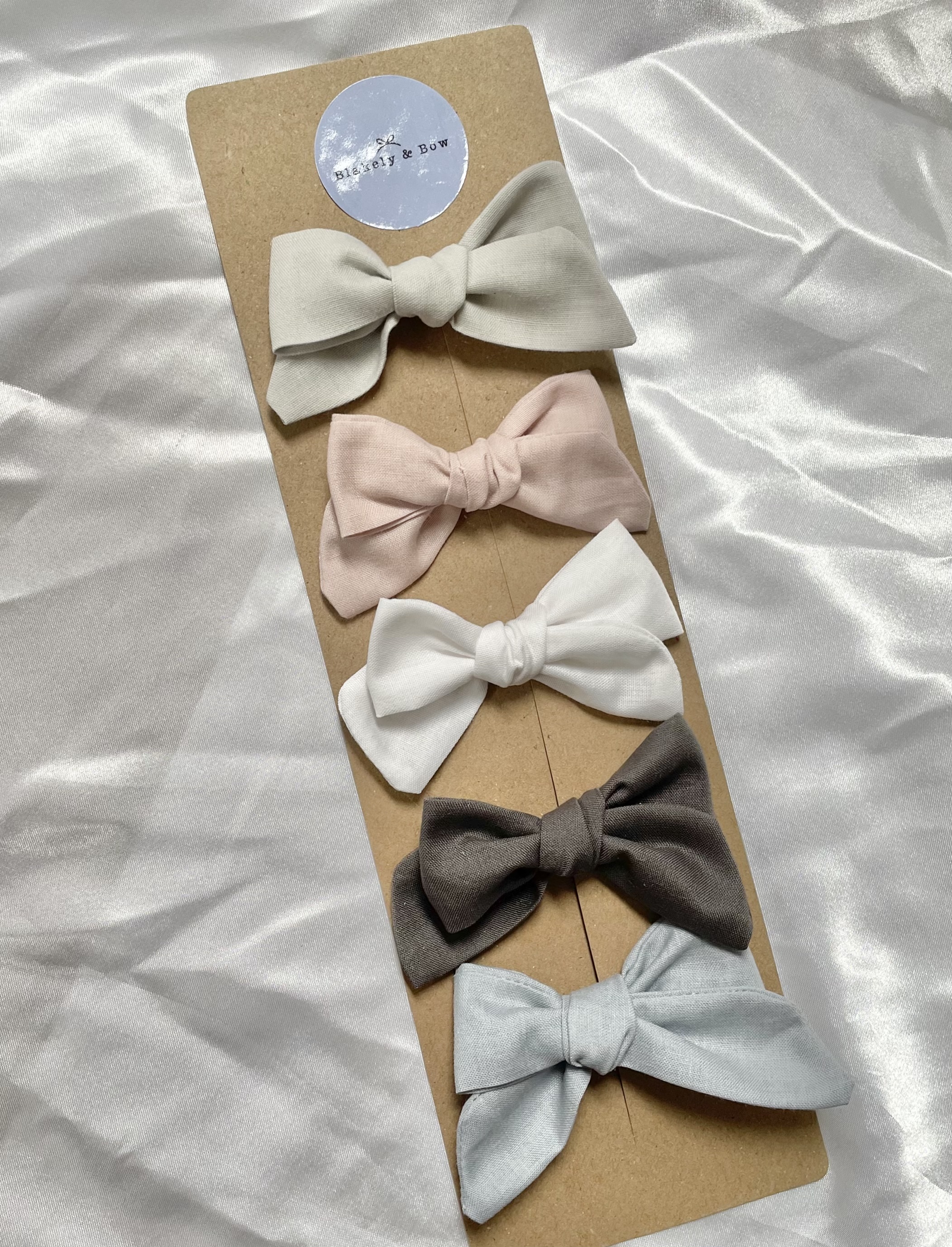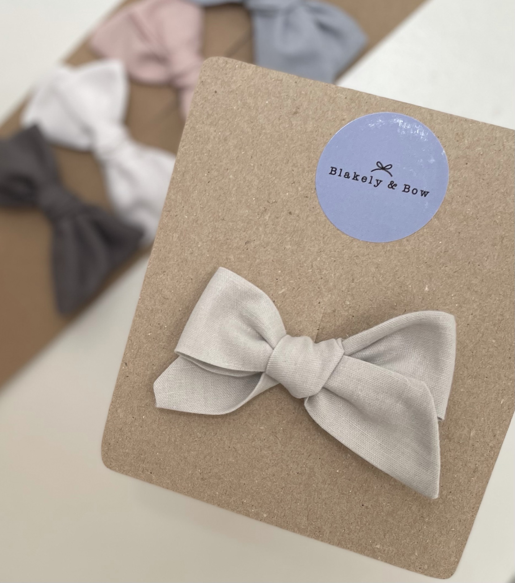 Bows colour options are available in pink, blue, light grey, charcoal grey, white or mixed. (mixed= a box of a small selection of all of above colours)