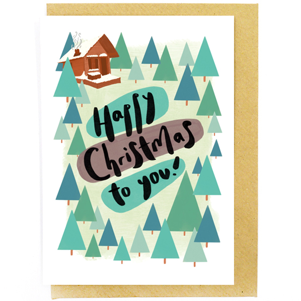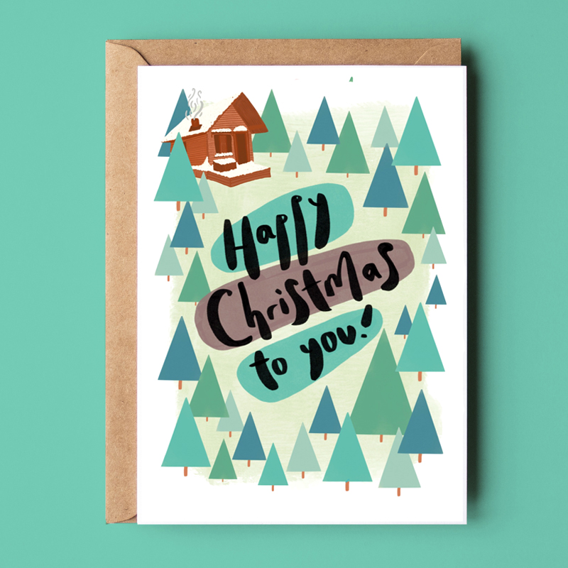 This quirky and vibrant Christmas greetings card features a quaint snowy log cabin scene surrounded by festive pine trees illustrations. Available as a single card or as part of our Christmas card pack featuring all 5 of our festive designs together.