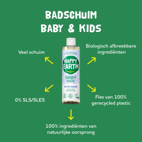Happy Earth Bath foam for babies and children contains only 100% natural ingredients that are certified by NatrueIn addition, it contains the bath foam 0% SLS/SLES and is this microplasticvrij, so that you can be sure that you are not applying harmful products to your baby’s skin. The bath foam contains rich natural oils that help to hydrate and care for the skin. It is extra mild for the sensitive skin of babies and children and can be used directly from birth. It has a delicious, allergen-free perfume and is biodegradable. After use of this bath foam is the skin of your baby soft and smells delicious.