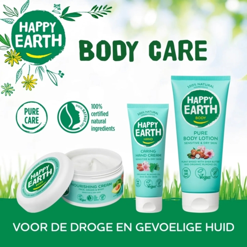 This hand cream has been specially developed for sensitive and dry skin. It contains aloe vera, shea butter and organic almond oil that help hydrate and care for the skin naturally. The cream is absorbed very quickly and is not greasy. It has a lovely, allergen-free perfume that smells lightly of almond and peach. This product, like all other Happy Earth products, is 100% microplastic-free. The packaging is a 100% biobased tube made from sugar cane and Happy Earth is produced in the Netherlands with green energy.