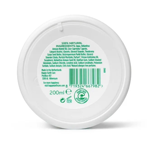 This nourishing cream is specially developed for sensitive and dry skin. It contains avocado oil, cocoa butter, and shea butter that help hydrate and care for the skin naturally. This cream has a delightful, allergen-free perfume that lightly smells of almond and peach. This product, like all other products from Happy Earth, is 100% microplastic-free. The packaging is made from recycled plastic and Happy Earth is produced in the Netherlands with green energy.