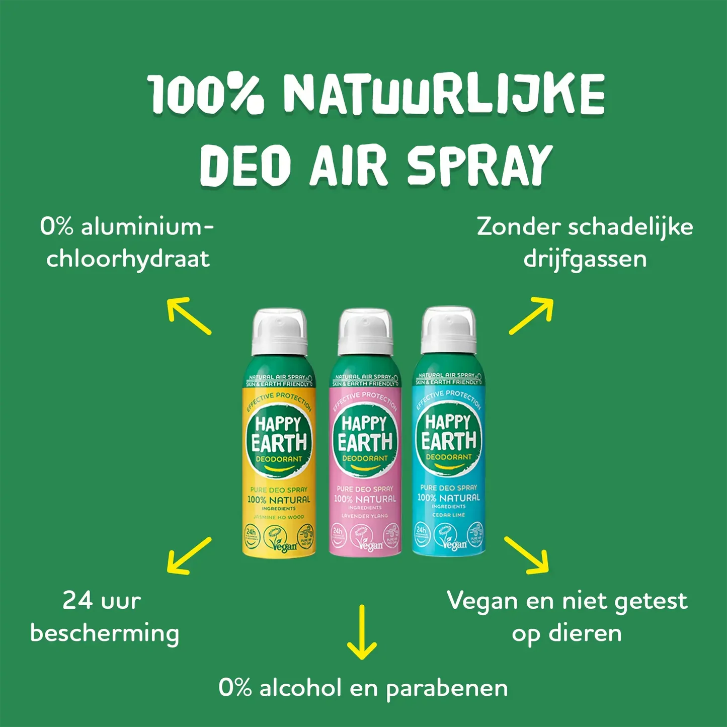 Traditional deodorant sprays contain propellants to push the product out of the spray can. Propellants can cause skin irritation. Not only are propellants bad for your body, but they are also harmful to the ozone layer due to high CO2 emissions. Happy Earth 100% Natural deo spray works entirely on pure air pressure through an innovative technology, so without these harmful propellants.