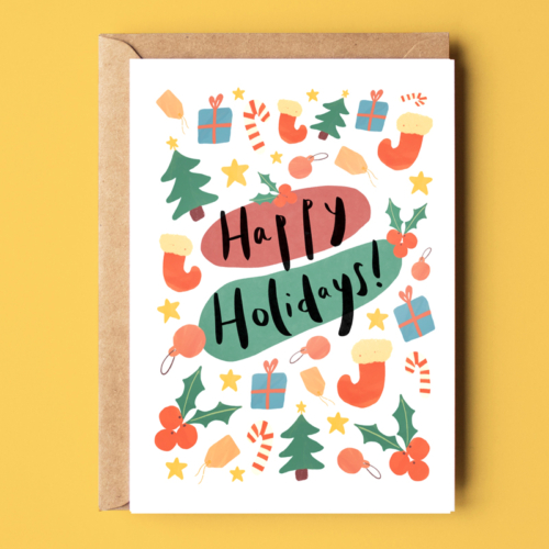 This quirky and vibrant Christmas card features cute festive illustrations and has been printed on 100% UK recycled stock. Available as a single card or as part of our Christmas card pack featuring all 5 of our festive designs together.