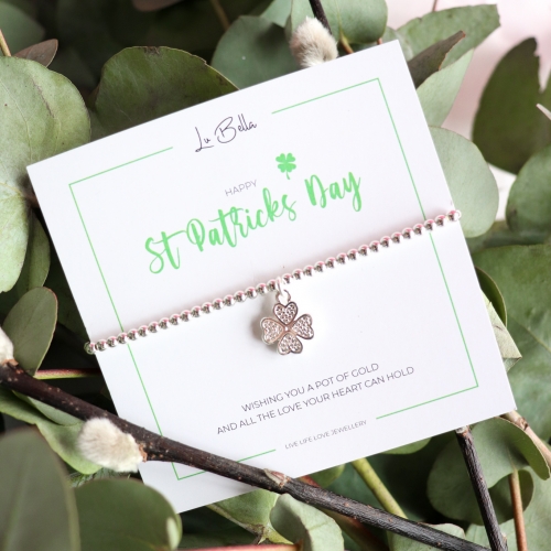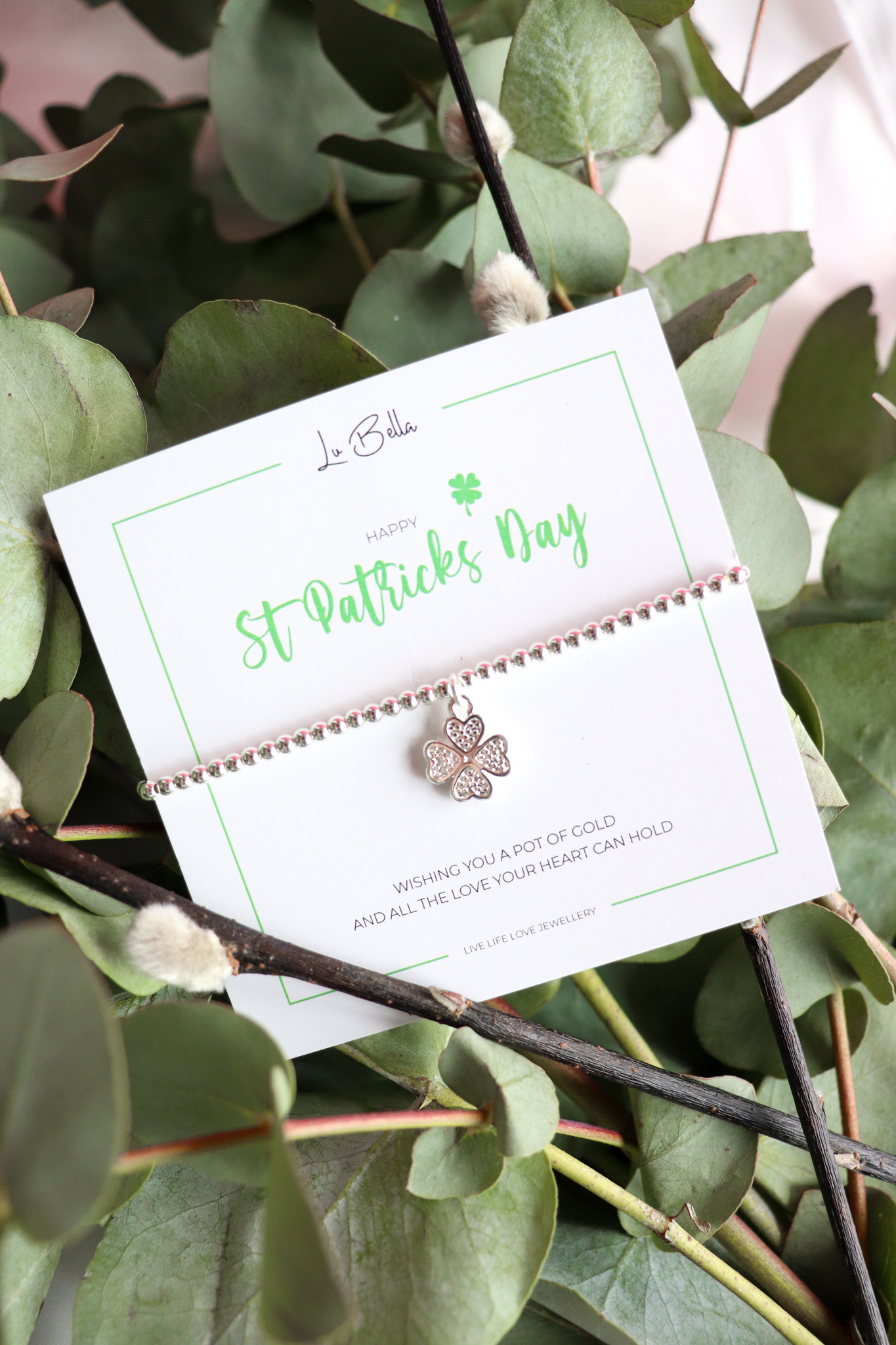 Wish someone special a happy St Patrick’s day with our lucky charm bracelet, created with 3mm silver plated beads with a detailed four leaf clover charm. Sitting on a lovely sentiment card that reads ‘Wishing you a pot of gold and all the love your heart can hold’.