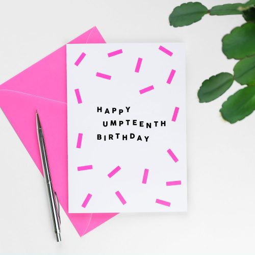 Hand-pressed with bright neon pink foil. Part of our Neonfetti range – all hand-pressed by us in our Rutland studio. Printed on 120mm x 170mm 350gsm uncoated card for a quality finish and feel. Comes with a matching neon pink envelope. Card and envelope will be sent in a sturdy card-backed envelope. We’ve taken the #nakedcards pledge to cut out plastic card wrappers. You can find out more by searching the hashtag on social media.
