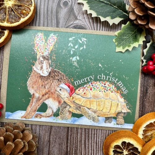 Hare and Tortoise Beautiful Christmas Eco Friendly Art Card
