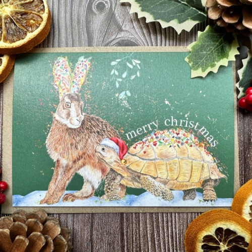 Hare and Tortoise Beautiful Christmas Eco Friendly Art Card