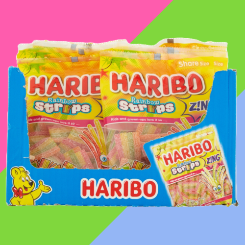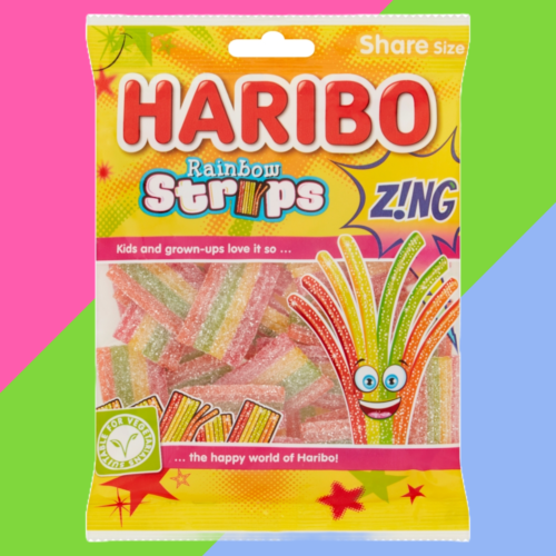 Sour fruit flavour gummy sweets Suitable for vegetarians 12 x 130g share bags Dear HARIBO Fans, We hope you enjoy this fun of Sour Rainbow Strips. Peel off each colour and try the fruity flavours! Enjoy! From HARIBO