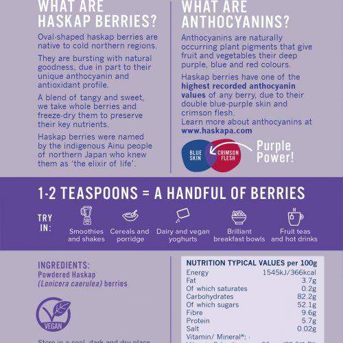 Haskapa Berry Powder can be added to numerous foods and drinks – anything from sprinkled over fruit, stirred into yoghurt, added to your morning smoothie or porridge. We also love this superberry powder in our Californian Frozen Haskapa Berry Bowl. Read more ways to enjoy Haskapa Berry Powder here.