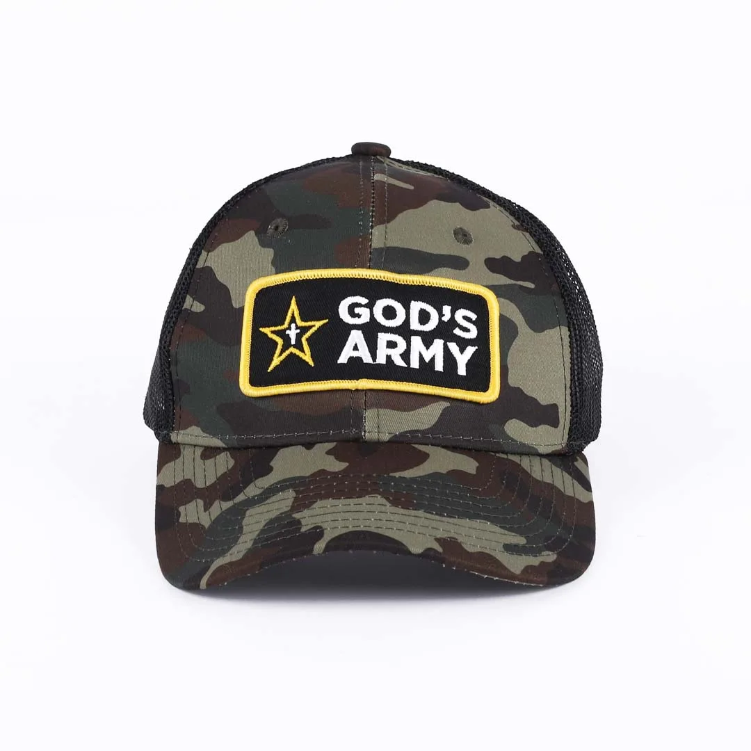 Designed with a classic camo front panel and a breezy black mesh back, this cap strikes the ideal balance between a classic aesthetic and modern flair. The centerpiece of this cap is the intricately embroidered patch proudly displaying the phrase God’s Army in crisp black and white with a touch of bright yellow. The detailed embroidery not only adds texture and definition but also lends a touch of individuality and style to your look.