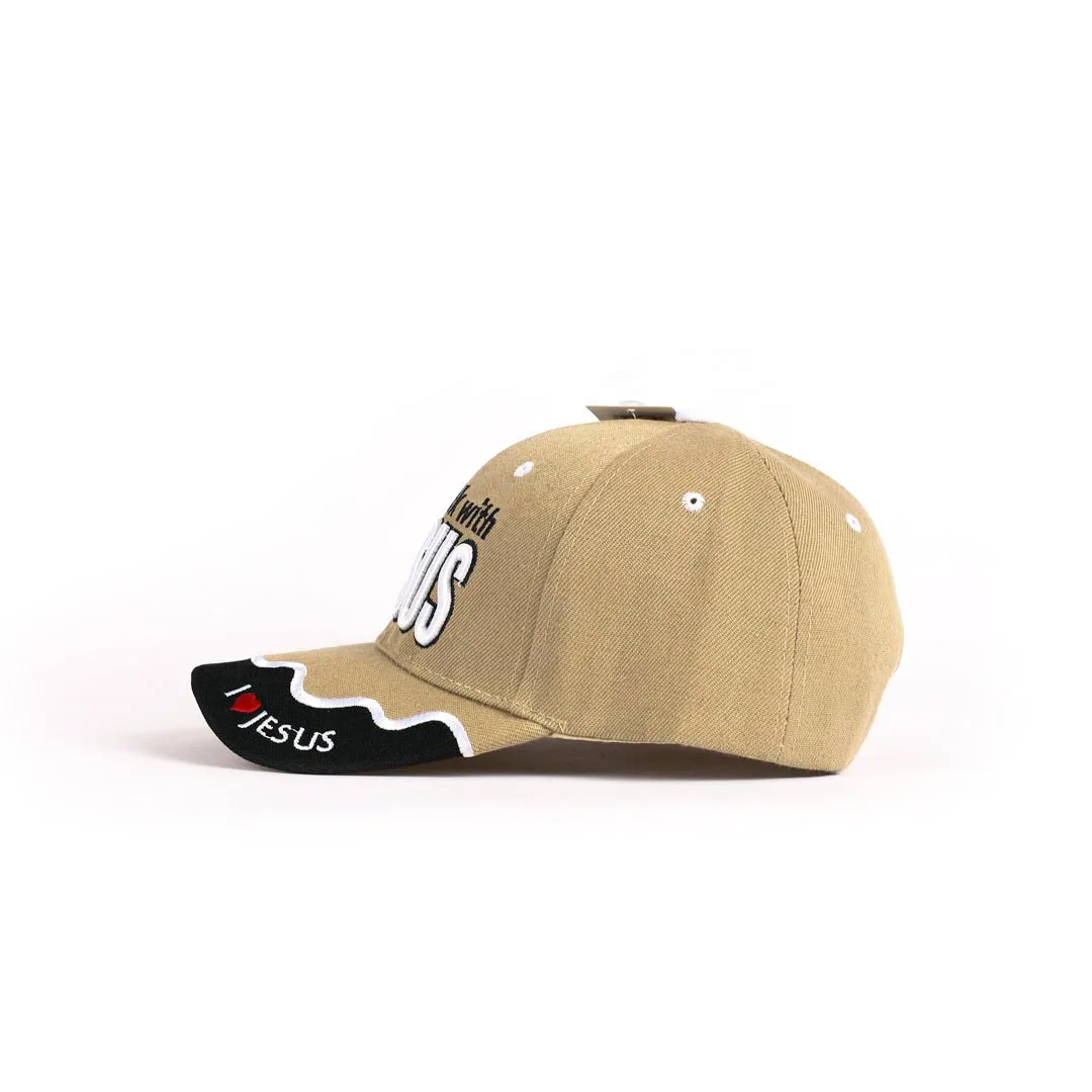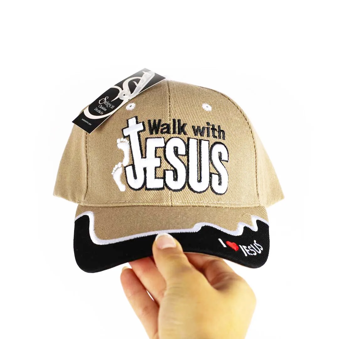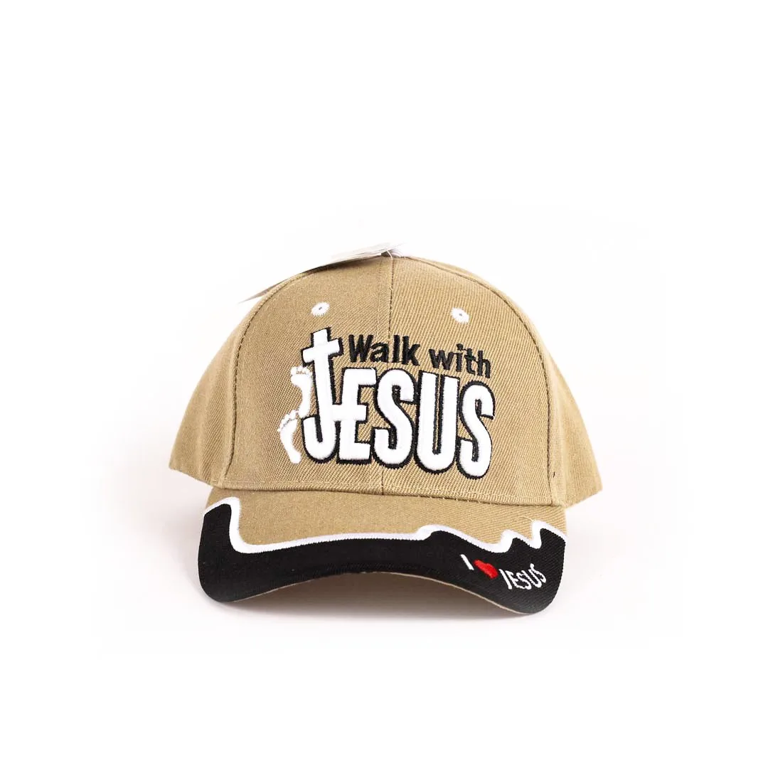 This khaki and black cap is adorned with a Walk with Jesus design, making it not just a fashion statement but also an expression of faith. The I Love Jesus message, embroidered on the bill and back, serves as a reminder of your beliefs and adds an extra layer of meaning to your outfit. The black and white embroidery contrasts beautifully with the khaki and black cap, ensuring that your faith is showcased in a stylish way.