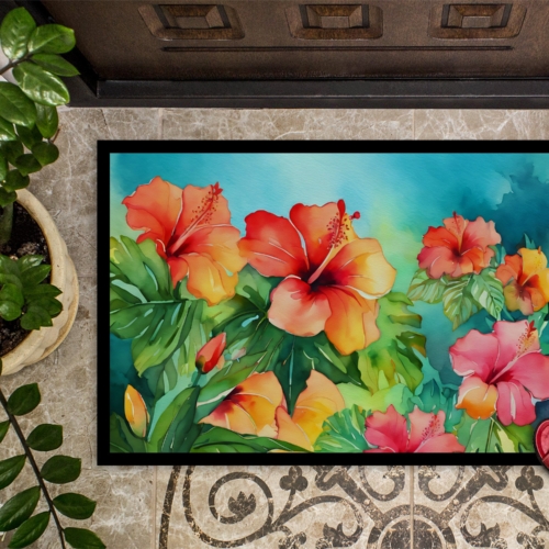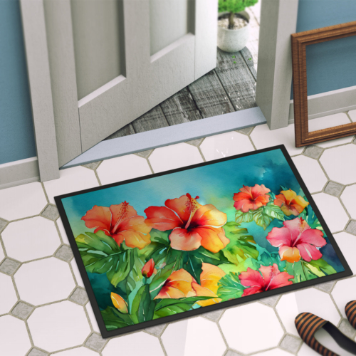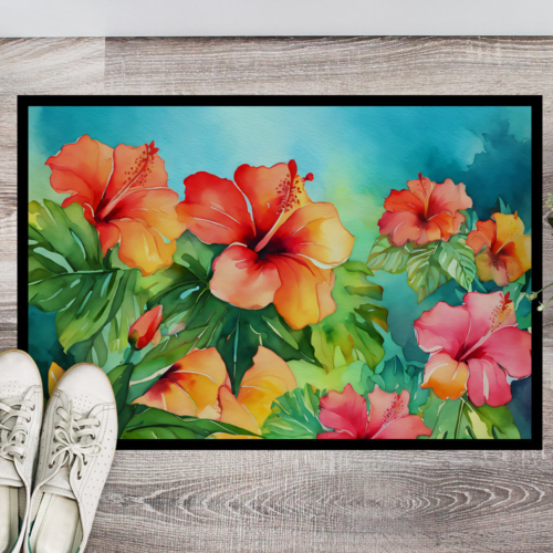 Doormat featuring breed specific Hawaii Hawaiian Hibiscus artwork. Welcome your guests in style with our Artwork Door Mat, designed to withstand almost any weather condition. This mat, measuring approximately 18 by 27 inches, is held together by durable black binding tape. Its top layer, composed of polyester felt, is dyed with the eye-catching image you see on the mat. A few layers below provide the mat with stability, while its rubber bottom is stamped to help prevent slipping and ensures safety. Our mat works wonderfully as both an indoor or outdoor door mat. For cleaning, simply hose it off with water or use a power washer – no need for any cleaner that produces suds. Avoid scrubbing with a brush, instead, opt for the vacuum on floor setting. Designed manufactured and printed in the USA, this mat is a perfect addition to your porch, outdoor kitchen, entryway, or any indoor space. Its unique design makes it a charming decorative rug that greets your guests and adds a stylish touch to your home decor.