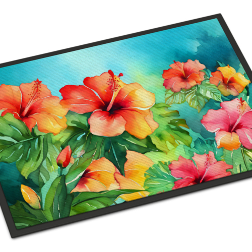 Doormat featuring breed specific Hawaii Hawaiian Hibiscus artwork. Welcome your guests in style with our Artwork Door Mat, designed to withstand almost any weather condition. This mat, measuring approximately 18 by 27 inches, is held together by durable black binding tape. Its top layer, composed of polyester felt, is dyed with the eye-catching image you see on the mat. A few layers below provide the mat with stability, while its rubber bottom is stamped to help prevent slipping and ensures safety. Our mat works wonderfully as both an indoor or outdoor door mat. For cleaning, simply hose it off with water or use a power washer – no need for any cleaner that produces suds. Avoid scrubbing with a brush, instead, opt for the vacuum on floor setting. Designed manufactured and printed in the USA, this mat is a perfect addition to your porch, outdoor kitchen, entryway, or any indoor space. Its unique design makes it a charming decorative rug that greets your guests and adds a stylish touch to your home decor.