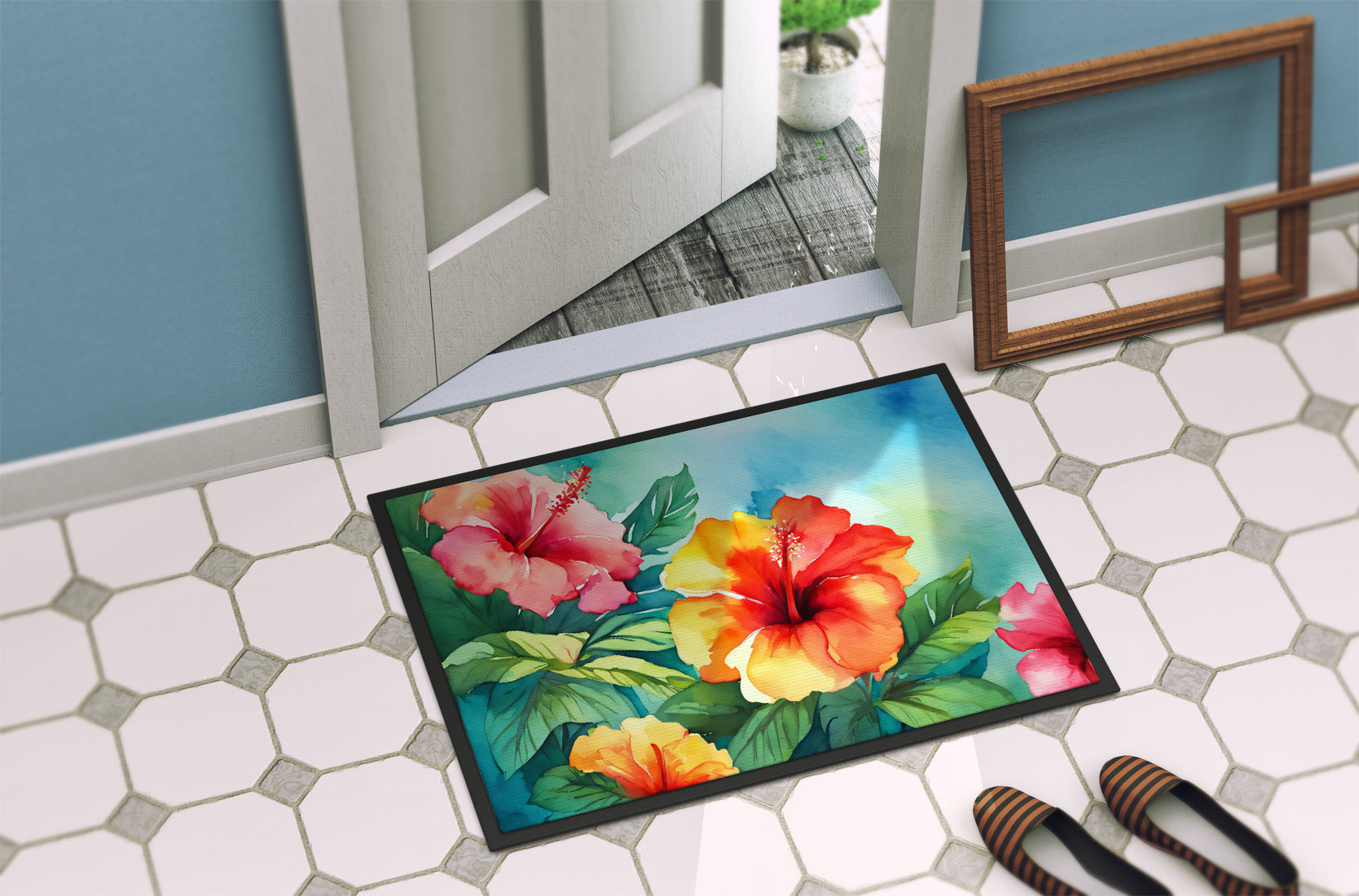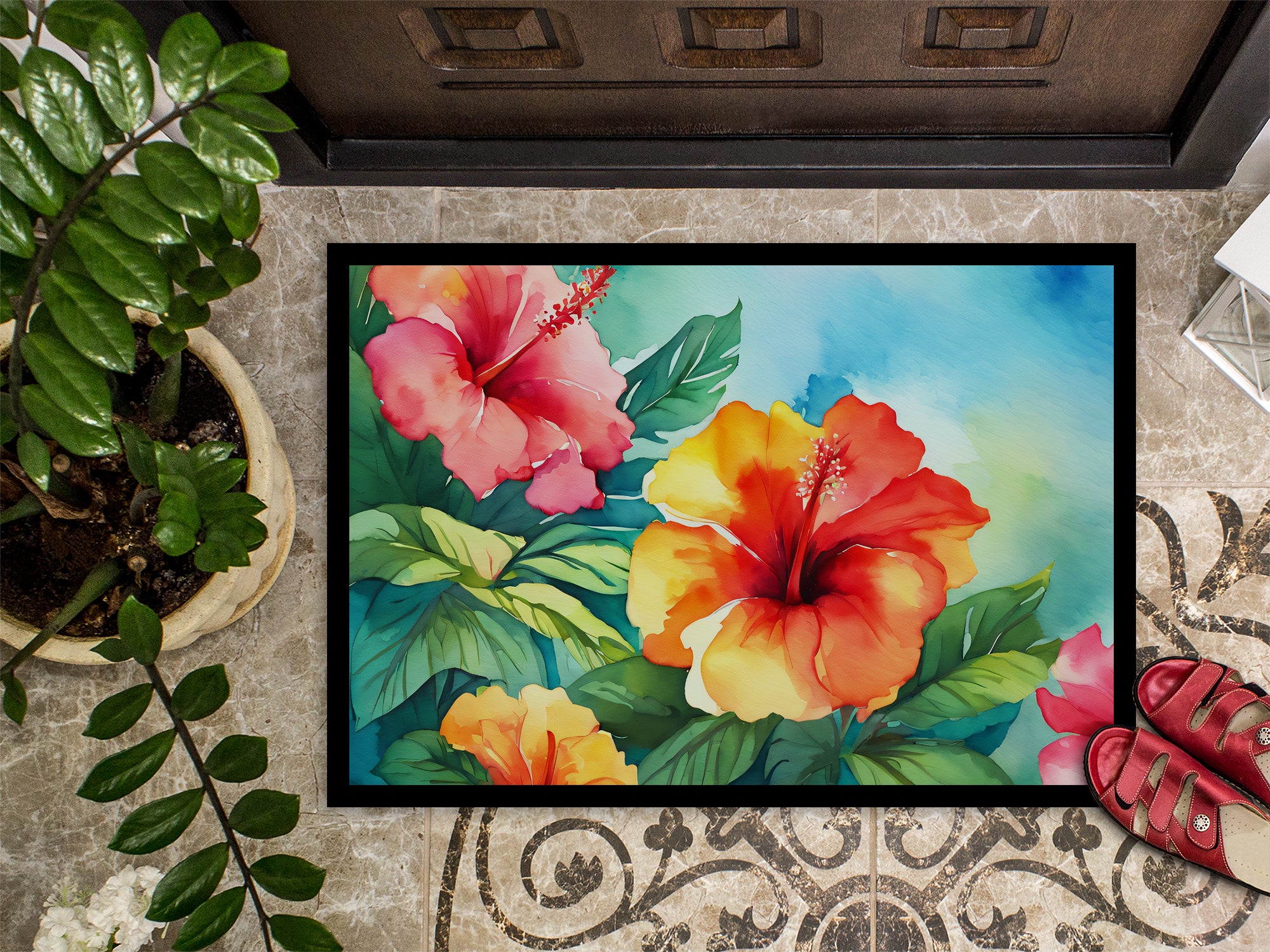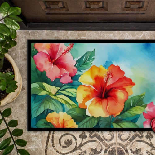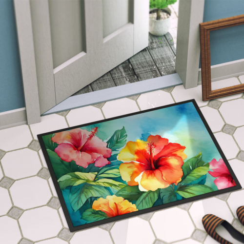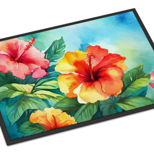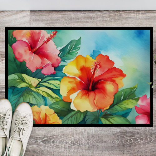Doormat featuring breed specific Hawaii Hawaiian Hibiscus artwork. Welcome your guests in style with our Artwork Door Mat, designed to withstand almost any weather condition. This mat, measuring approximately 18 by 27 inches, is held together by durable black binding tape. Its top layer, composed of polyester felt, is dyed with the eye-catching image you see on the mat. A few layers below provide the mat with stability, while its rubber bottom is stamped to help prevent slipping and ensures safety. Our mat works wonderfully as both an indoor or outdoor door mat. For cleaning, simply hose it off with water or use a power washer – no need for any cleaner that produces suds. Avoid scrubbing with a brush, instead, opt for the vacuum on floor setting. Designed manufactured and printed in the USA, this mat is a perfect addition to your porch, outdoor kitchen, entryway, or any indoor space. Its unique design makes it a charming decorative rug that greets your guests and adds a stylish touch to your home decor.