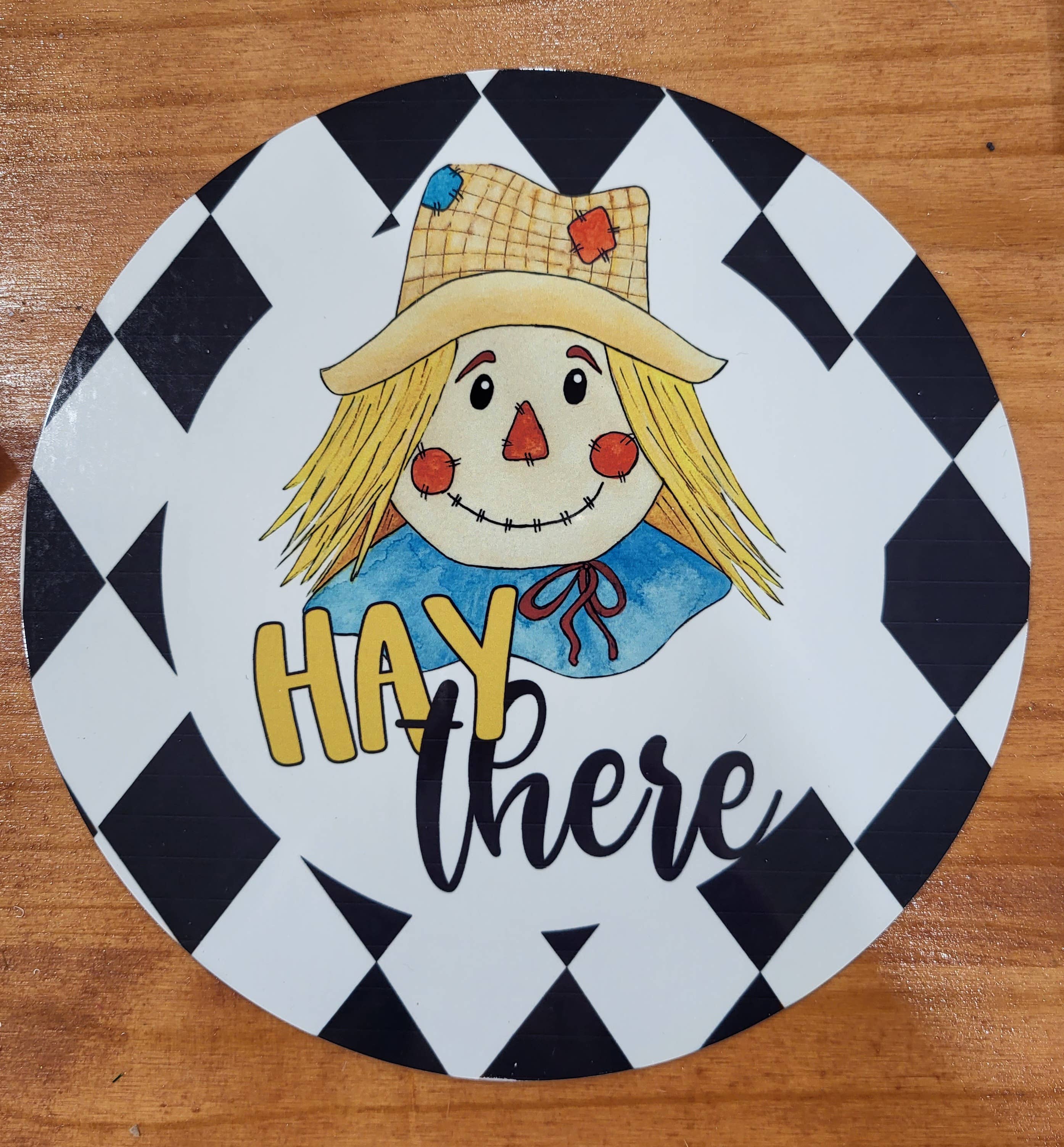 This cute scarecrow sign is a great addition to any wreath. It is made from products from the USA and is aluminum. It is a scarecrow with the writing Hay There with black and white harlequin border. The sign is 8″ round.